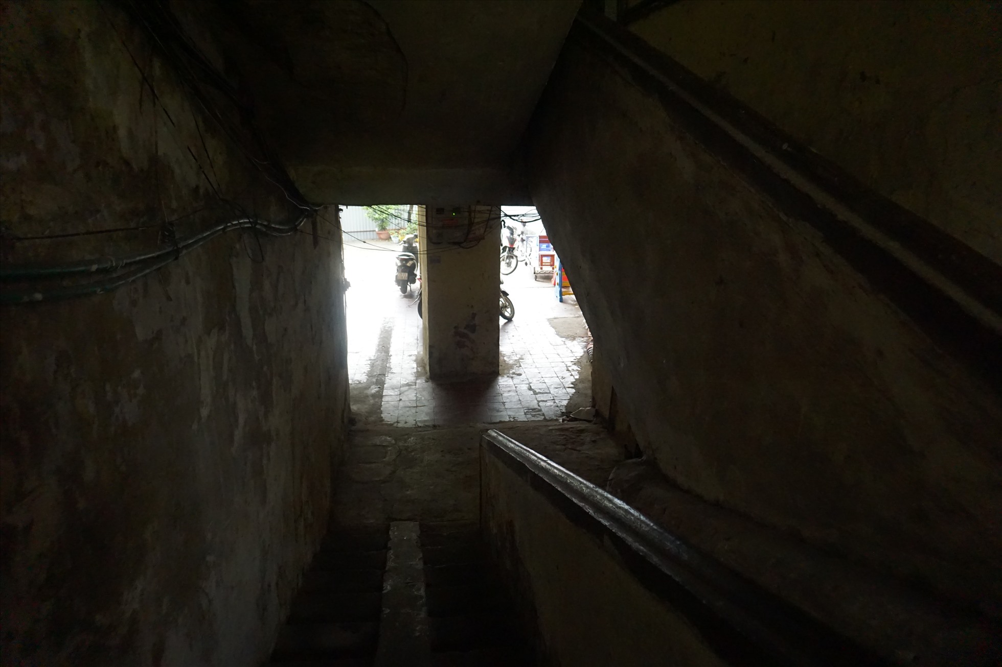 Khu vực cầu thang lên xuống tối om, ẩm thấp. Ảnh: Phương Anh