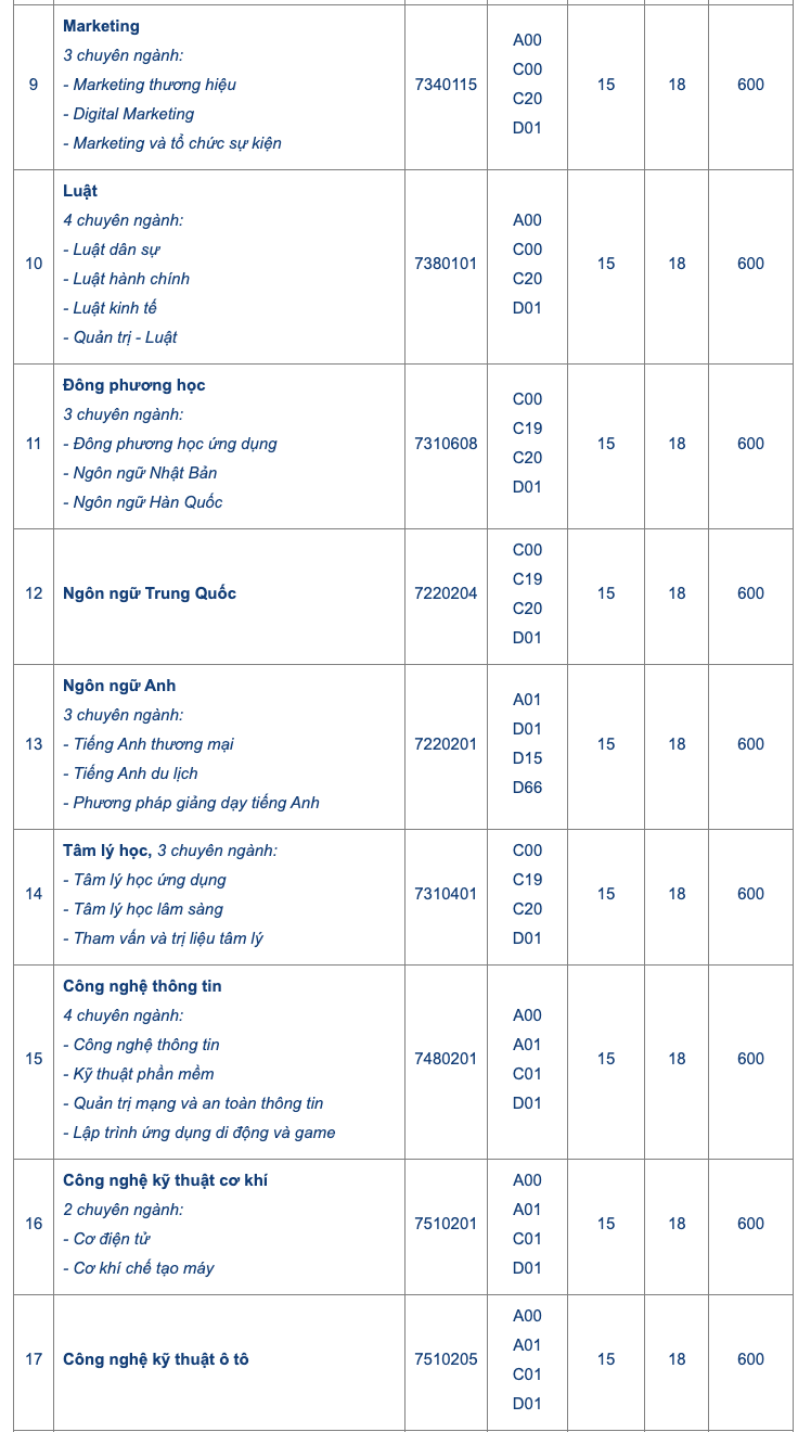 Tất cả các ngành còn lại mức điểm chung là 15 điểm.