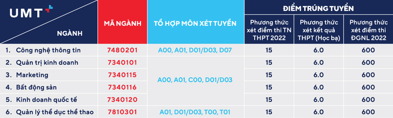 Trường Đại học Quản lý và Công nghệ TPHCM (UMT) mở xét tuyển sinh đợt bổ sung 6 ngành học: Công nghệ thông tin, Quản trị kinh doanh, Marketing, Bất động sản, Kinh doanh quốc tế, Quản lý thể dục thể thao với mức điểm cụ thể như sau: