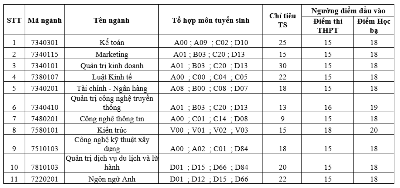 Trường thông báo tiếp tục xét tuyển bổ sung ở nhiều ngành học năm 2022 như Kế toán, Kiến trúc, Quản trị kinh doanh, Công nghệ thông tin,...