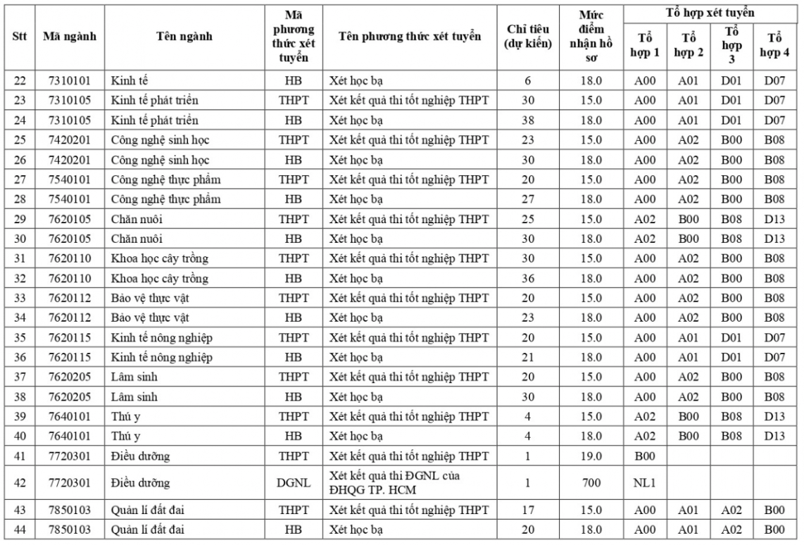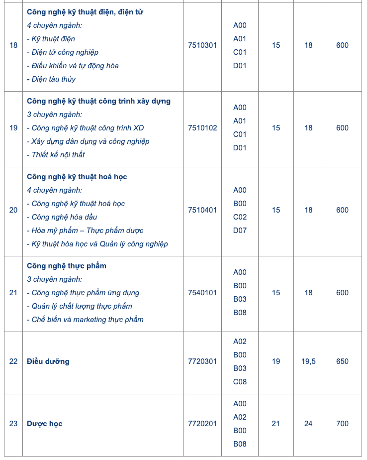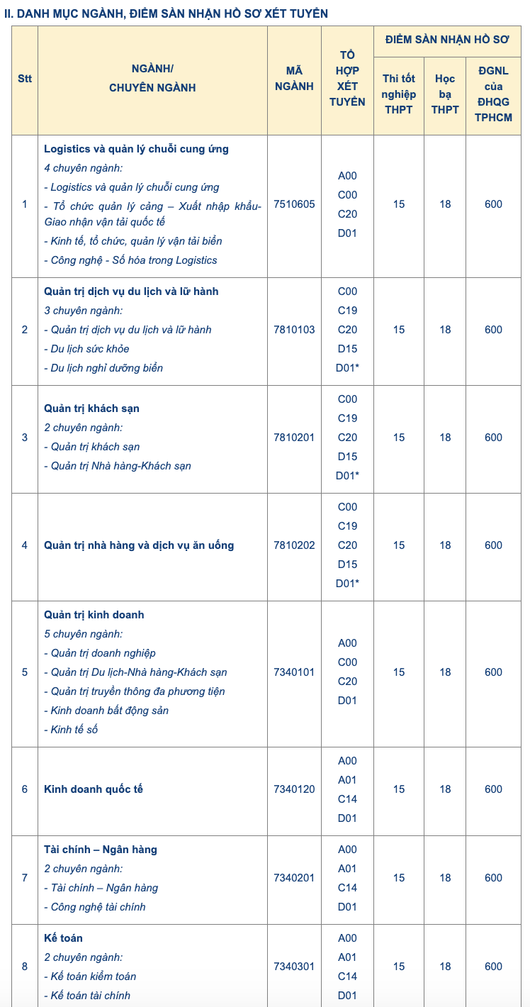 Danh sách chi tiết các ngành xét tuyển: