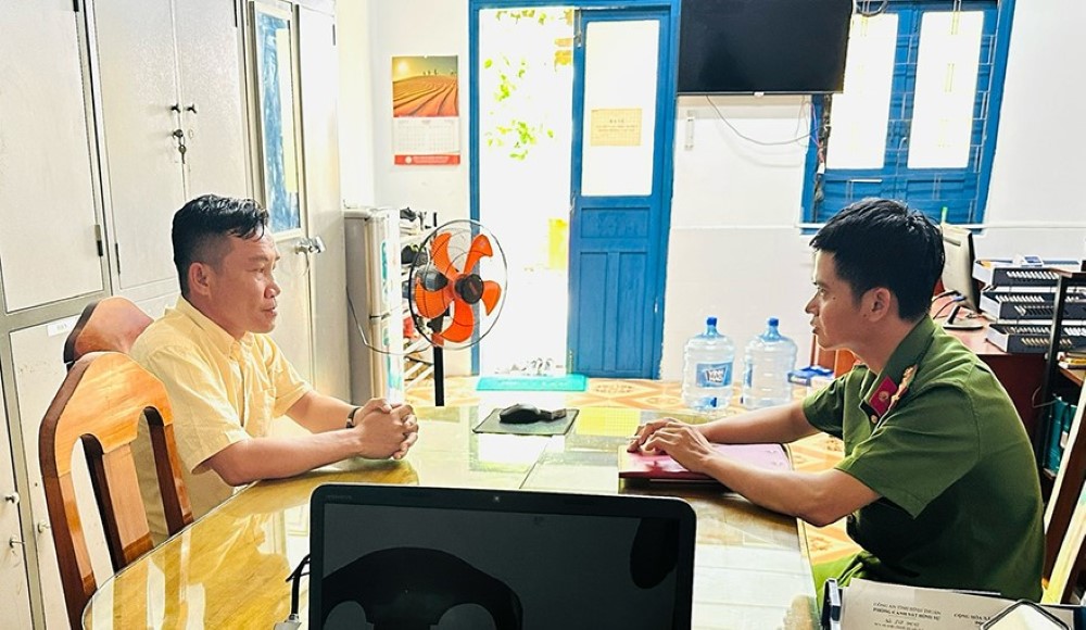 Mai Xuân Thường làm việc tại cơ quan công an về hành vi lừa đảo, chiếm đoạt tài sản. Ảnh: Công an