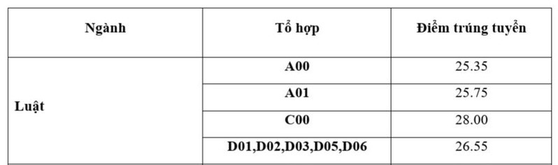 Chi tiết điểm chuẩn ngành Luật các tổ hợp xét tuyển năm 2023 của trường như sau: