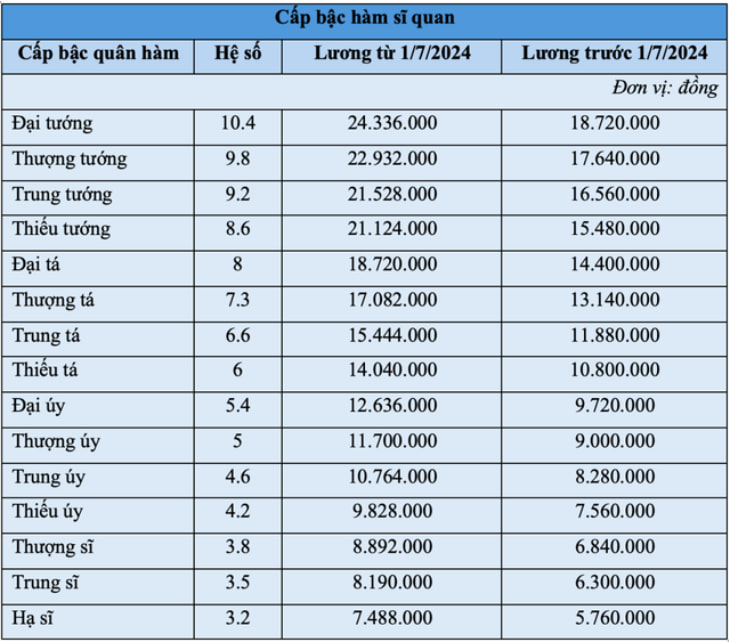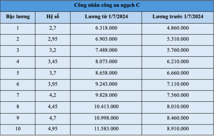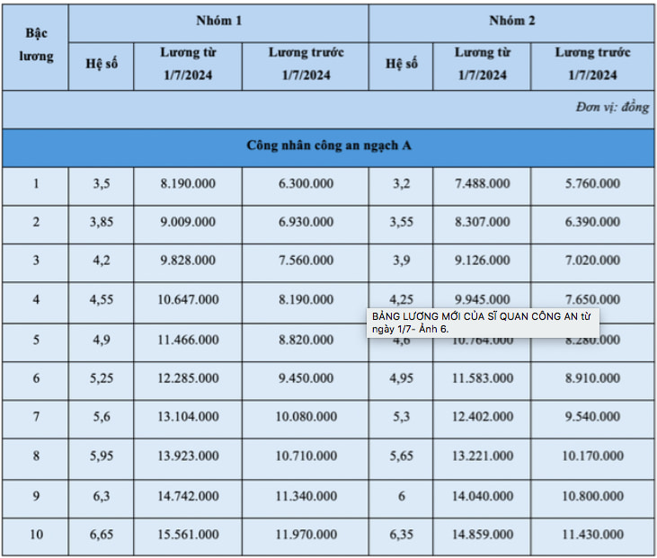 Mức lương của công an được tính theo công thức: Tiền lương = hệ số lương x lương cơ sở. Theo đó, mức lương cơ sở từ ngày 1.7 là 2,34 triệu đồng/tháng. Dưới đây là bảng lương của công an các cấp.
