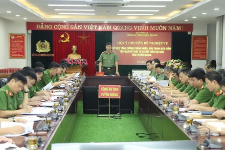 | Đại tá Phạm Kim Đĩnh, Giám đốc Công an tỉnh chủ trì hội ý chuyên đề nghiệp vụ về tăng cường phòng ngừa, đấu tranh kéo giảm tội phạm về trật tự xã hội trên địa bàn tỉnh Tuyên Quang. (Ảnh trong bài: Công an tỉnh Tuyên Quang) |