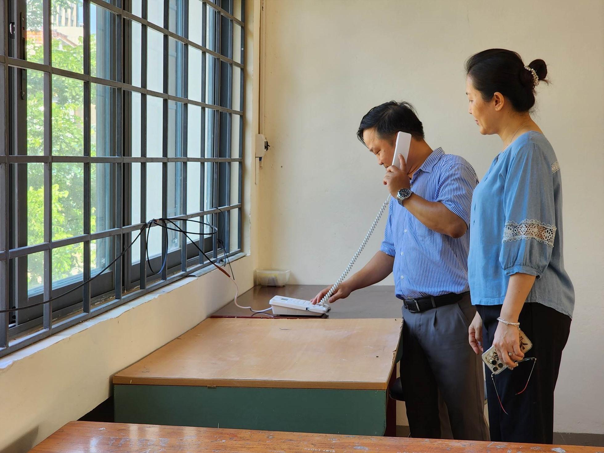 Mỗi điểm thi đều phải lắp đặt điện thoại để báo cáo tình hình hoặc có sự cố bất thường. Ảnh: Thuỳ Trang
