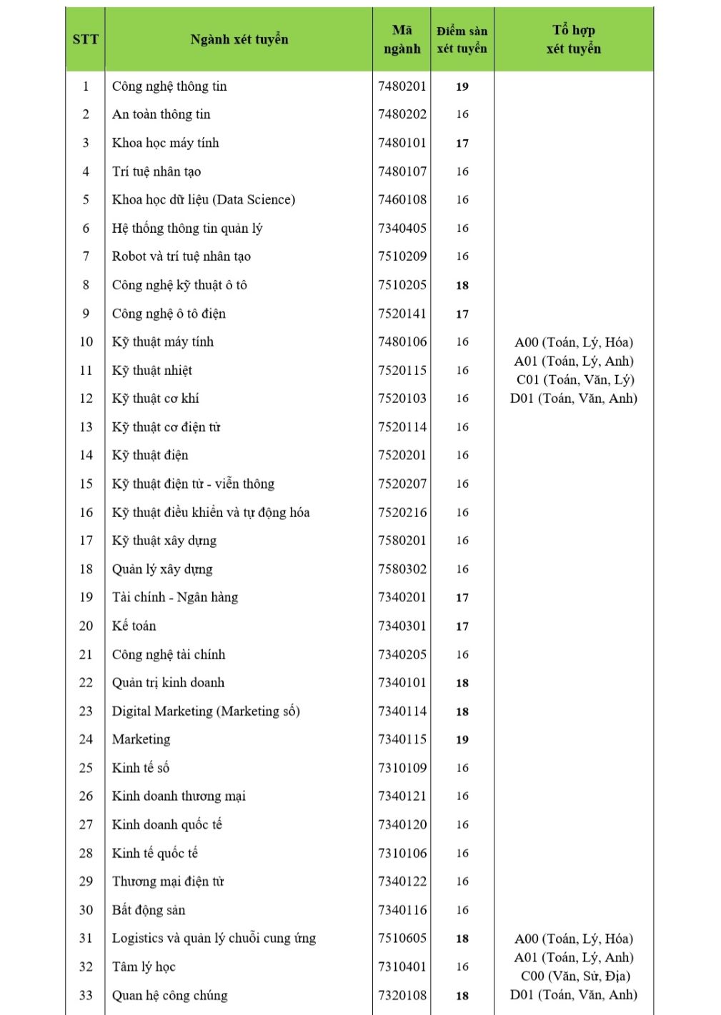 Trong đó, ngành Công nghệ thông tin, Truyền thông đa phương tiện, Marketing là 3 ngành có mức điểm sàn xét tuyển cao nhất với 19 điểm; tiếp theo là các ngành Công nghệ kỹ thuật ôtô, Quản trị kinh doanh, Digital Marketing, Logistics và quản lý chuỗi cung ứng, Quan hệ công chúng với 18 điểm.