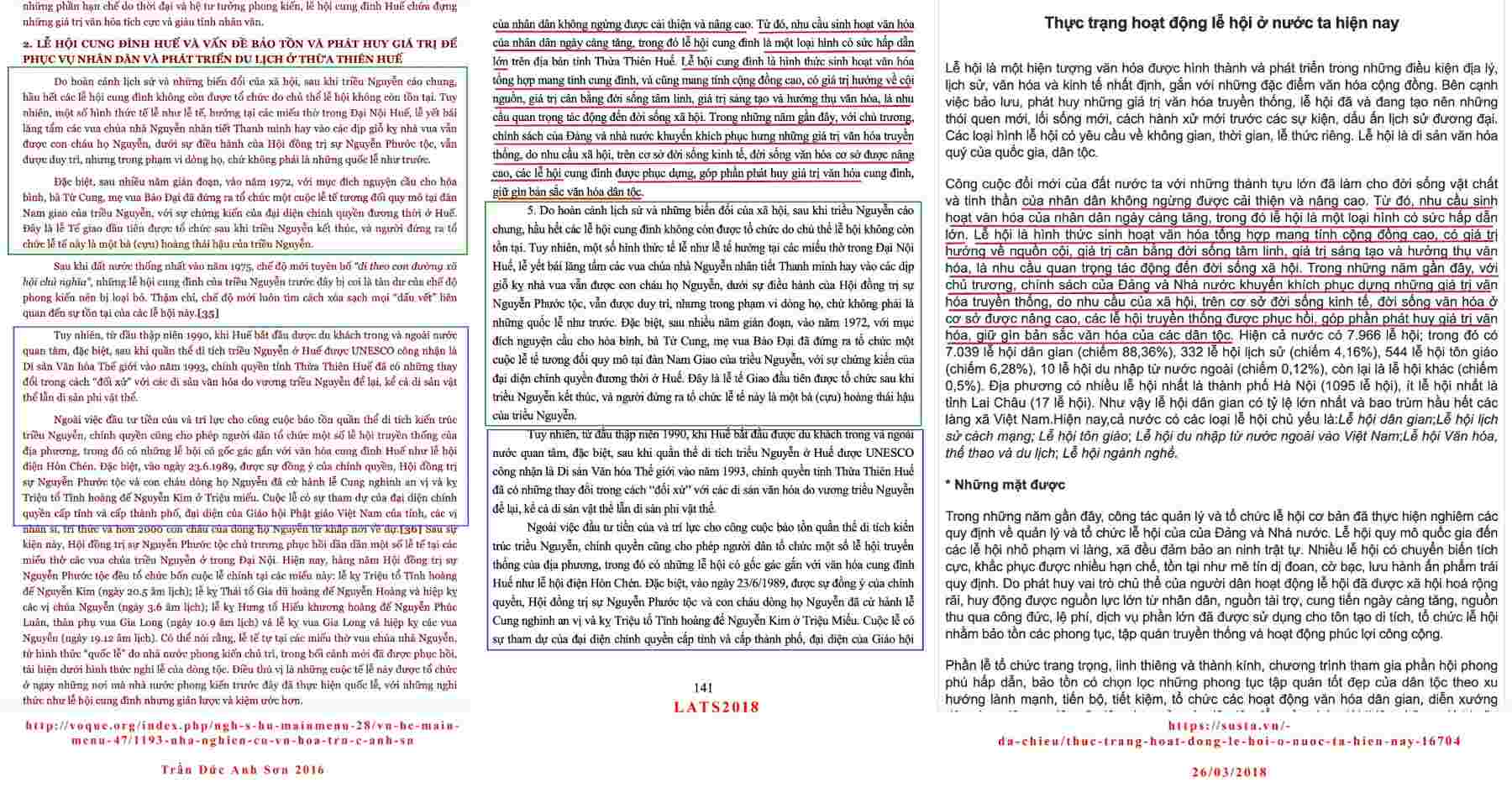 Nội dung chính văn ở trang 117 LATS 2018 (phía bải ảnh) có nội dung trùng khớp với nội dung viết về lễ hội cung đình ở trang 30 trong cuốn sách “Kiểu Huế” của tác giả Trần Đức Anh Sơn, xuất bản năm 2016, NXB Văn hoá - Văn nghệ TPHCM (phía trái ảnh).