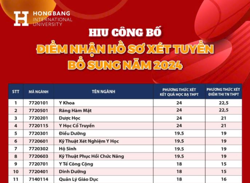 TPHCM - Trường Đại học Quốc tế Hồng Bàng (HIU) thông báo xét tuyển bổ sung 34 ngành với mức điểm bằng điểm chuẩn trúng tuyển đợt 1.