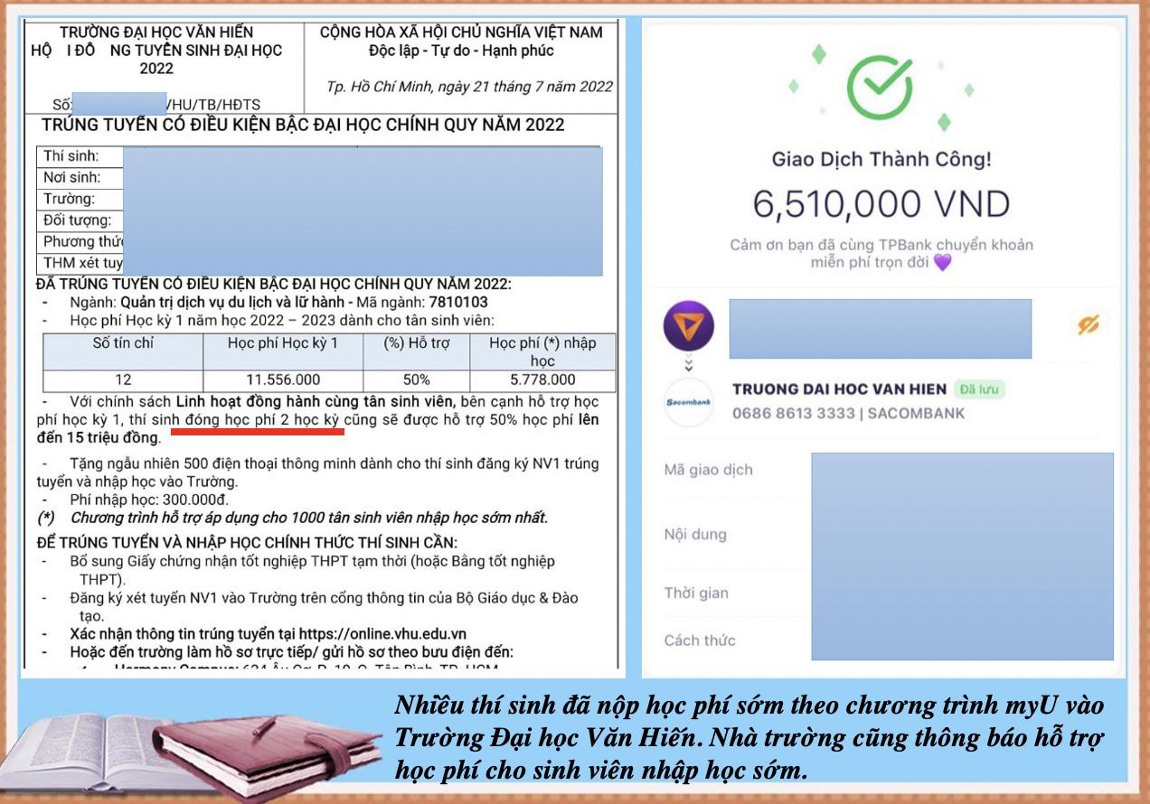 Bạn đọc M.T (Bình Định) phản ánh tới báo Lao Động về công tác tuyển sinh năm 2022 của VHU. Theo phản ánh, VHU đang thực hiện chương trình myU (theo thông báo ngày 20.7 và 26.7) và hỗ trợ giảm học phí (theo thông báo ngày 19.7) nhưng thực chất là một cách “lách” cho nộp phí sớm để nhận ưu đãi. Nếu sau đó thí sinh không theo học tại trường sẽ mất một khoản phí nhất định.