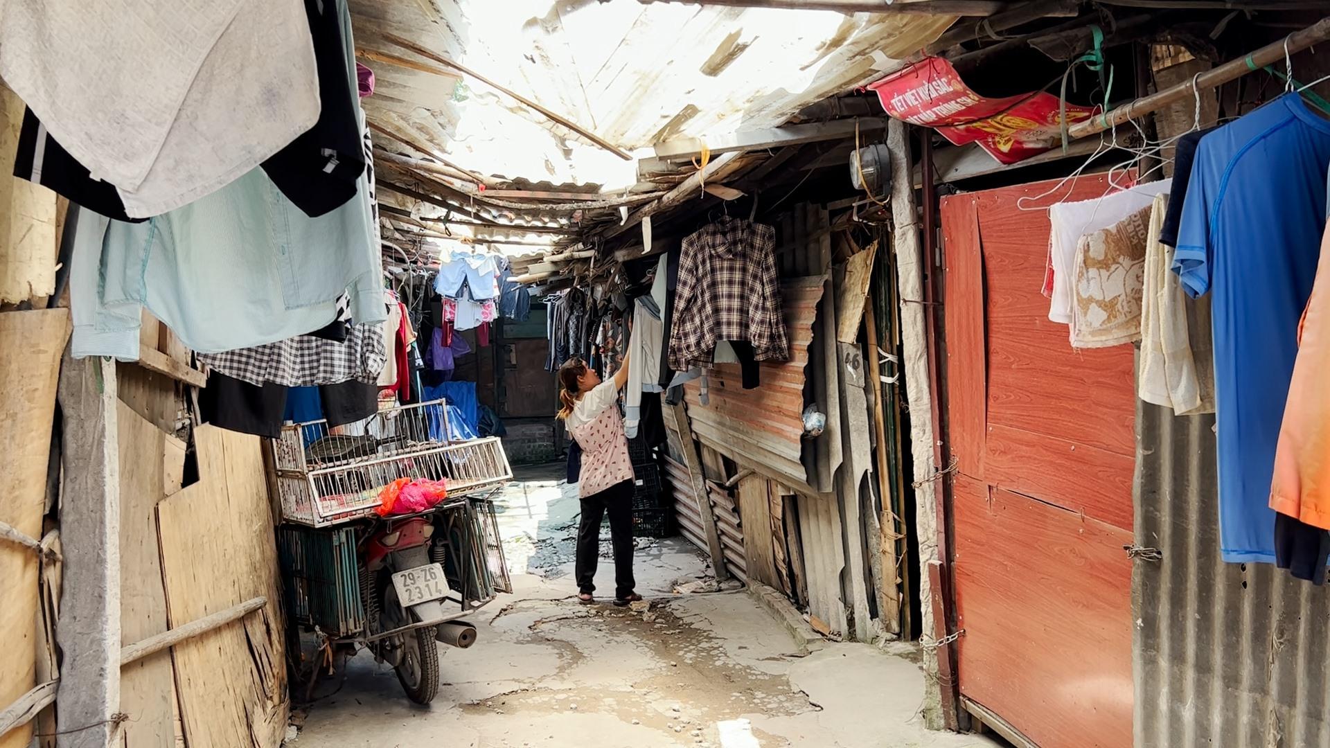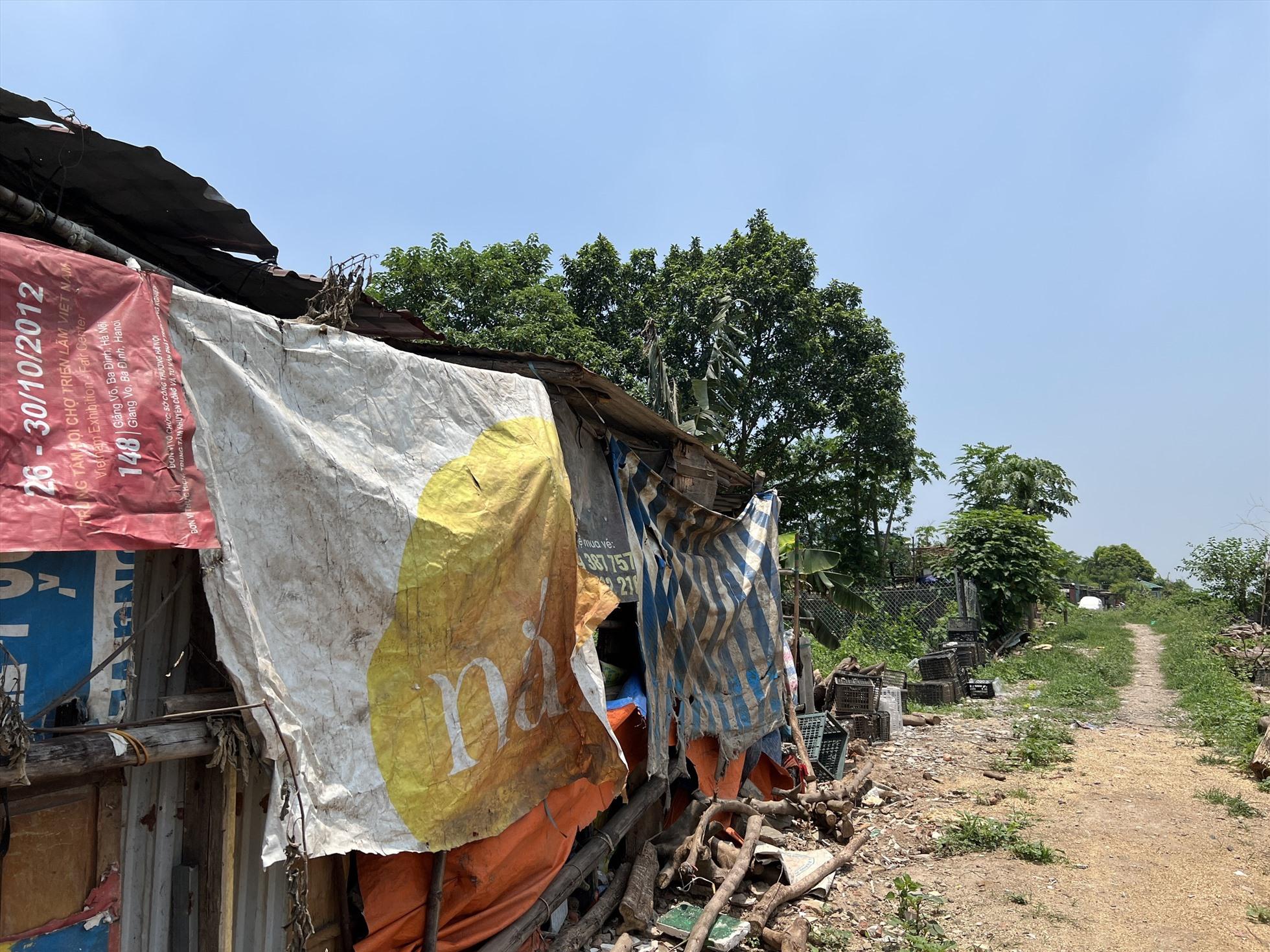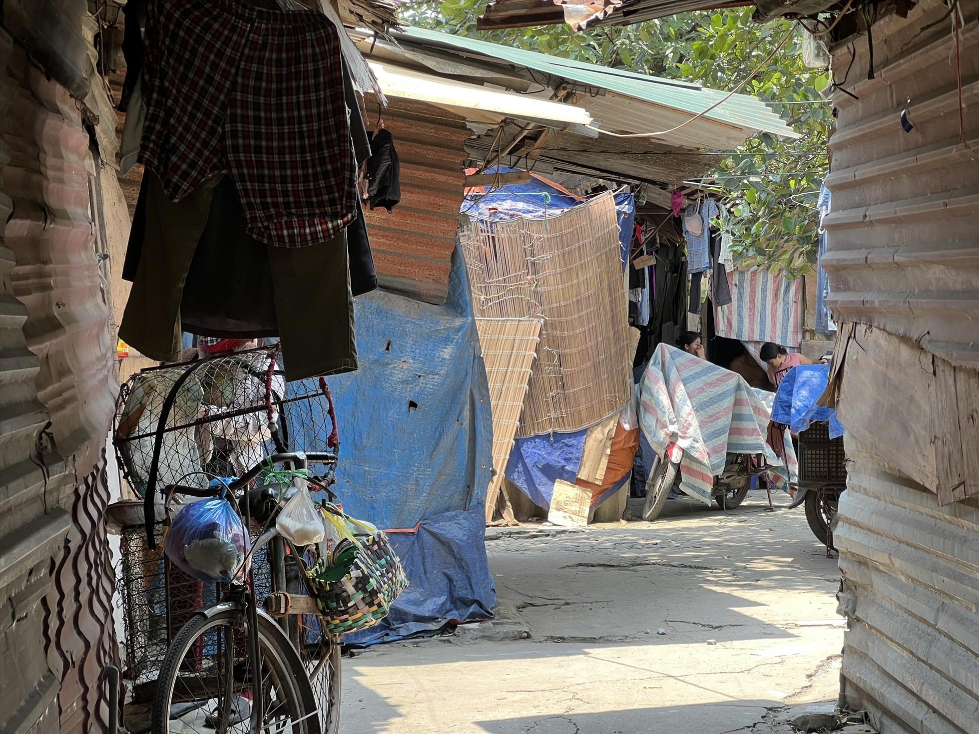 Sau lưng chợ Long Biên, len lỏi qua nhiều con hẻm, chúng tôi men theo một con đường đất để đến xóm trọ này. Khác với sự nhộn nhịp của các dãy phố, xóm trọ giống như một vùng quê thu nhỏ, nhà cửa xây dựng tạm bợ, hầu như được che, lợp bằng tôn và bạt.