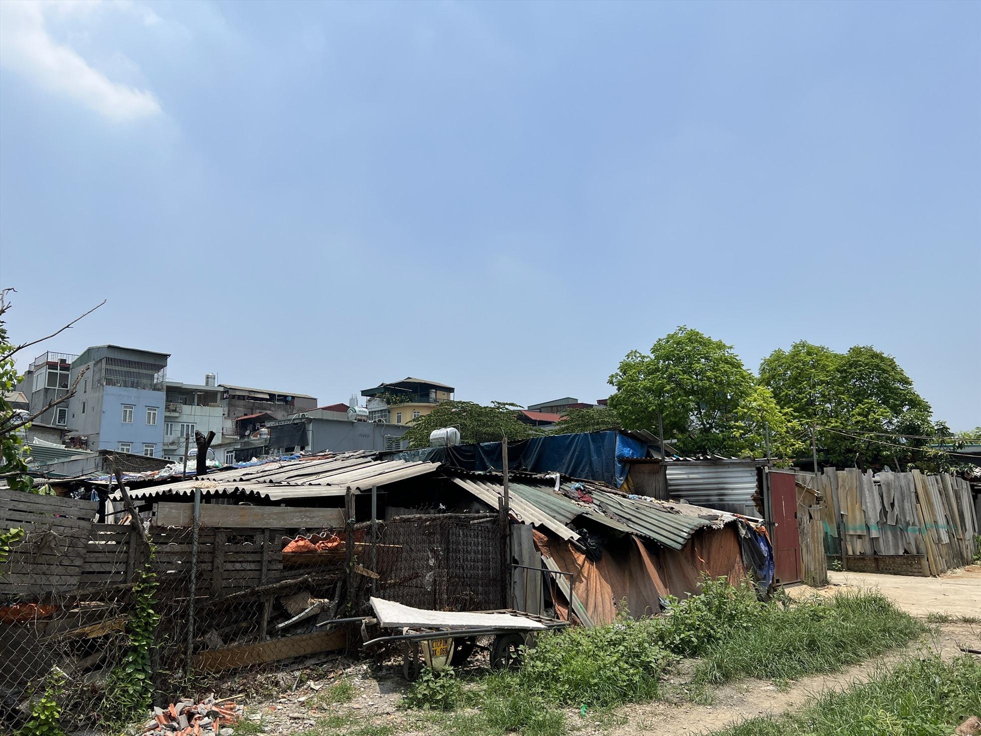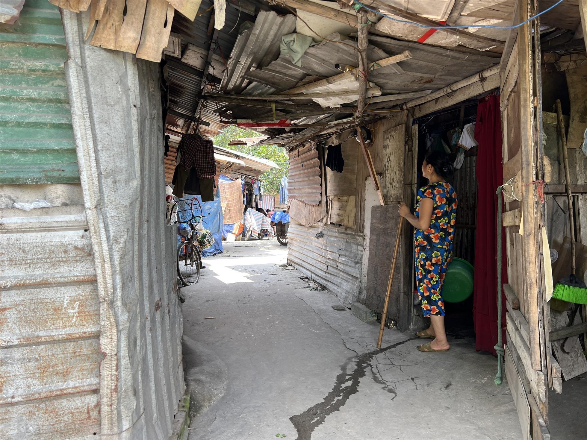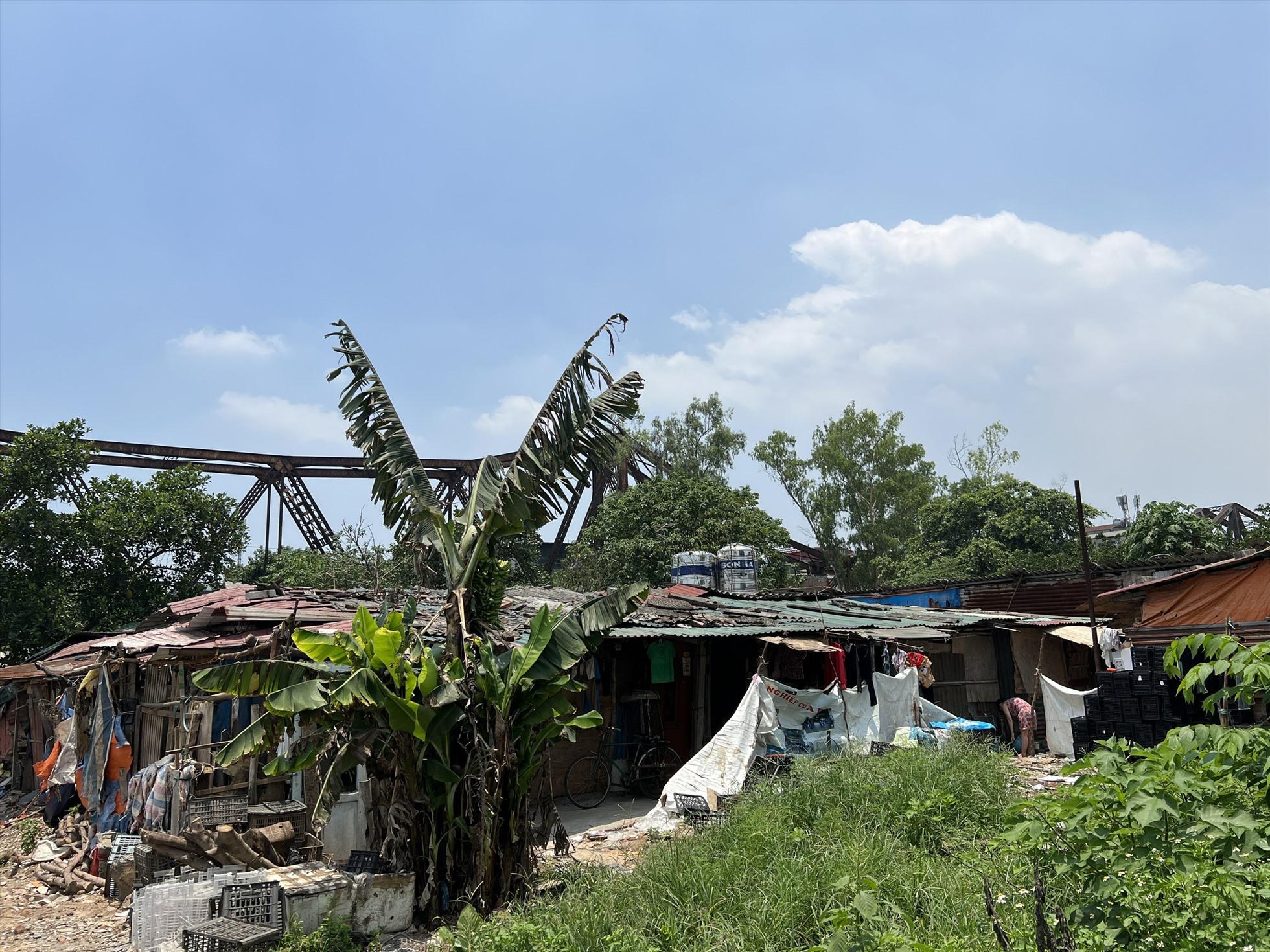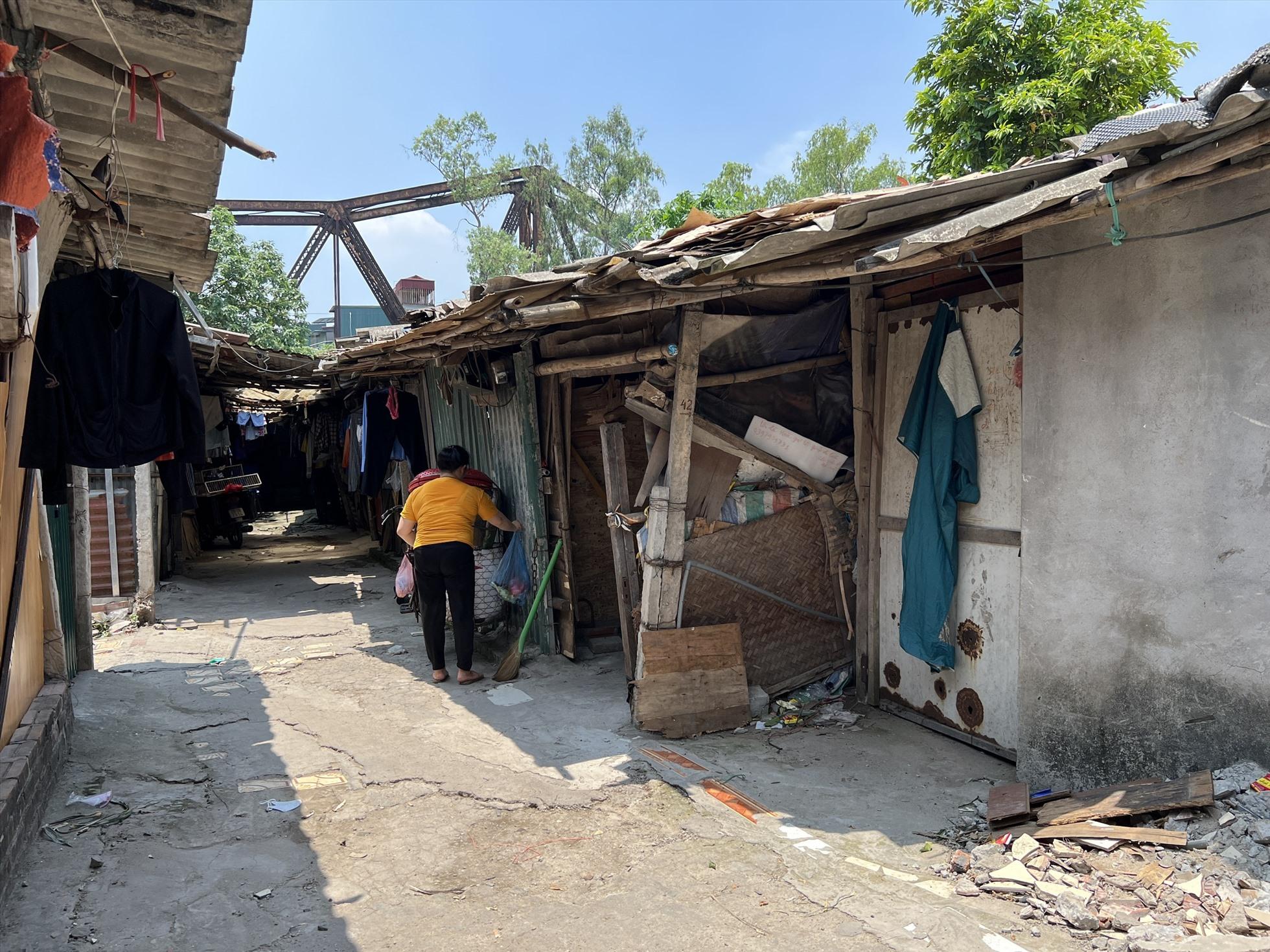 Sau lưng chợ Long Biên, len lỏi qua nhiều con hẻm, chúng tôi men theo một con đường đất để đến xóm trọ này. Khác với sự nhộn nhịp của các dãy phố, xóm trọ giống như một vùng quê thu nhỏ, nhà cửa xây dựng tạm bợ, hầu như được che, lợp bằng tôn và bạt.
