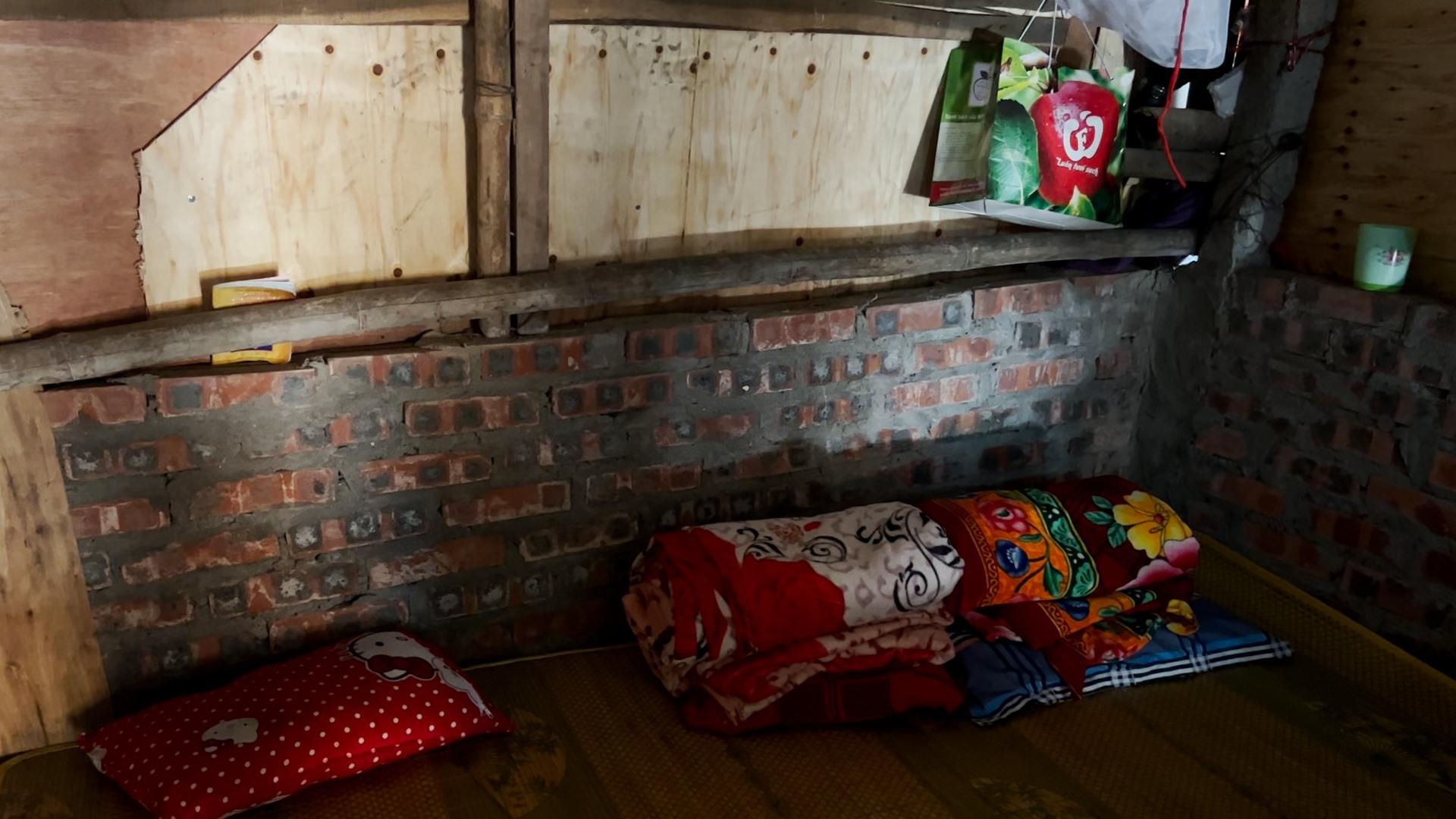 Chỗ ngủ của vợ chồng chị Dung đã được xây thêm gạch và chèn thêm ván gỗ để giảm bớt cái nóng nhưng vẫn "không ăn thua".