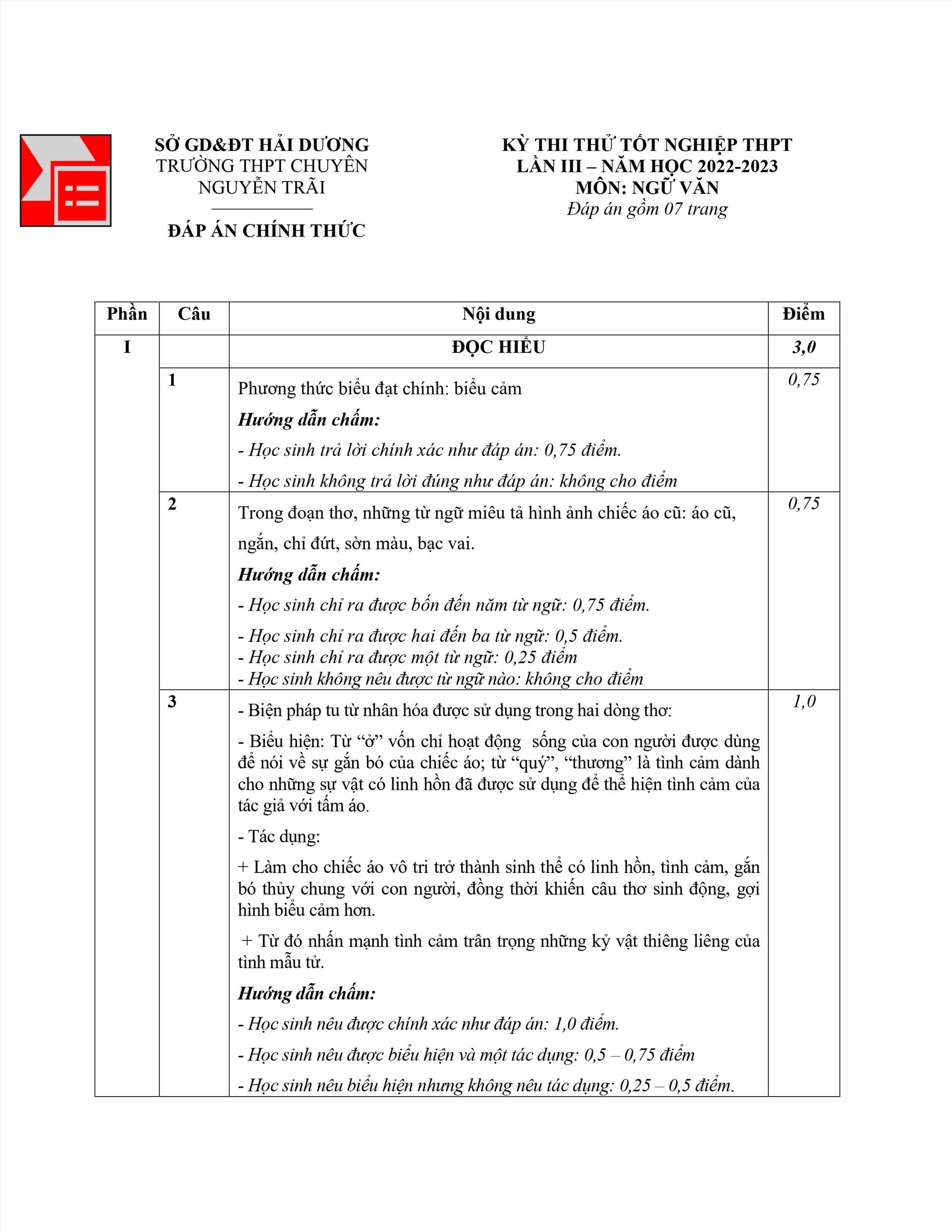 Dưới đây là đề thi, đáp án môn Ngữ văn trong kì thi thử tốt nghiệp lần 3 của Trường chuyên Nguyễn Trãi, tỉnh Hải Dương: