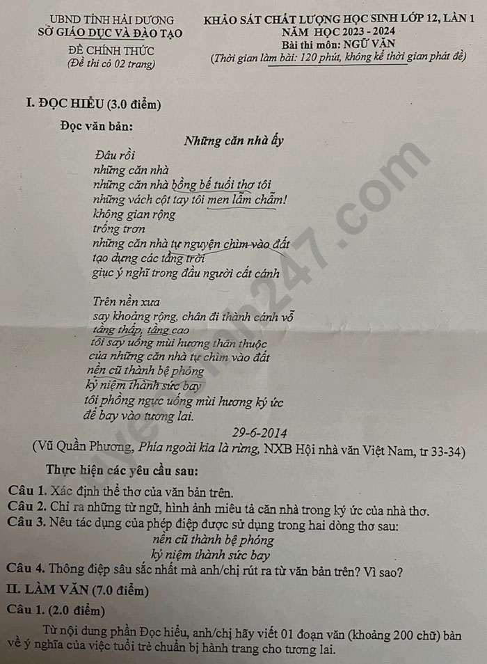 Đề thi thử tốt nghiệp THPT môn Văn tại Hải Dương. Ảnh: Tuyensinh247