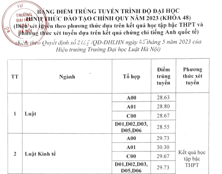 Điểm trúng tuyển Trường Đại học Luật Hà Nội năm 2023 hình thức đào tạo chính quy K48 theo phương thức xét kết quả học tập bậc THPT và xét kết quả chứng chỉ ngoại ngữ cụ thể như sau: