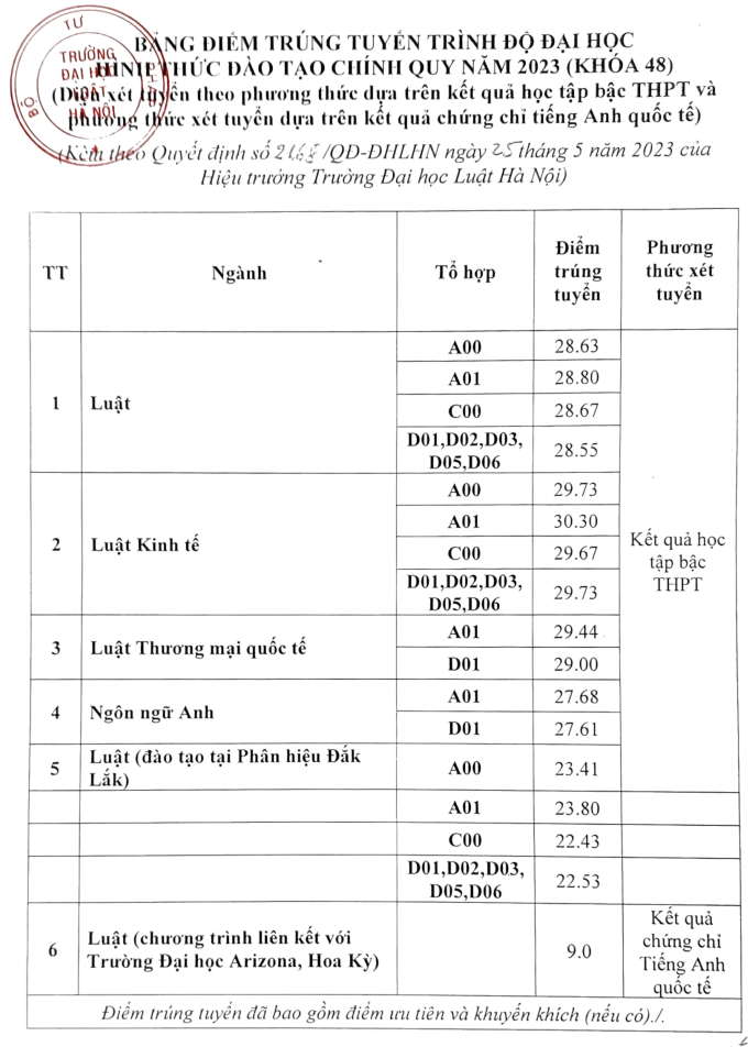 Điểm chuẩn học bạ Trường Đại học Luật Hà Nội năm 2023. Ảnh: Nhà trường