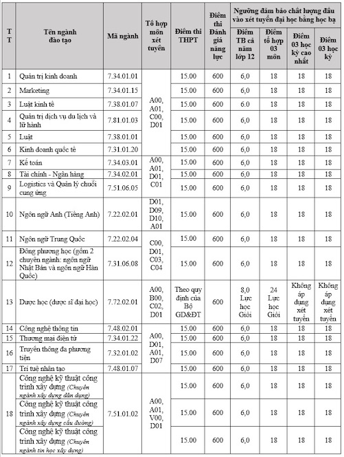 Đối với phương thức xét tuyển bằng điểm thi THPT: Ngưỡng đảm bảo chất lượng đầu vào đại học bằng kết quả thi THPT theo tổ hợp 3 môn là 15 điểm với tất cả các ngành. Riêng ngành Dược học theo quy định của Bộ Giáo dục và Đào tạo.