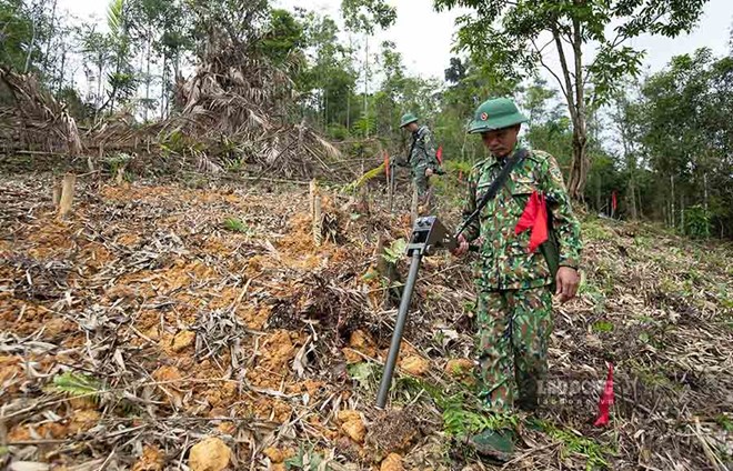 Lực lượng chức năng rà phá bom mìn, vật liệu nổ còn sót lại sau chiến tranh tại Hà Giang. Ảnh: Nguyễn Tùng