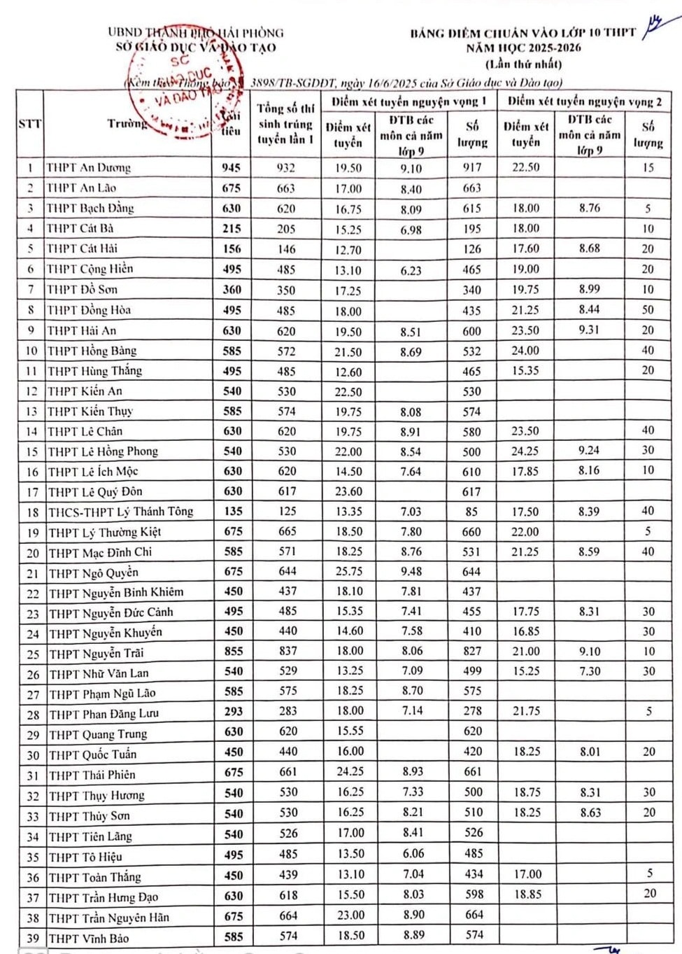 Trong đợt công bố đầu tiên, Trường THPT Ngô Quyền có mức điểm chuẩn cao nhất: 25,75 điểm. Theo sau là THPT Thái Phiên với 24,25 điểm và THPT Lê Quý Đôn đạt 23,6 điểm.