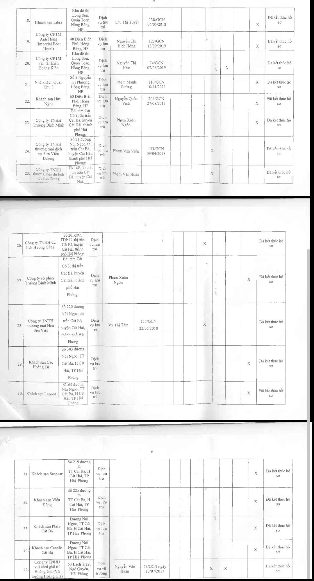 Sáng 7.3, Công an TP.Hải Phòng thông báo danh sách 35 cơ sở kinh doanh có điều kiện về an ninh trật tự bị thu hồi Giấy chứng nhận đủ điều kiện về an ninh trật tự, trong đó chủ yếu là nhà nghỉ, khách sạn.