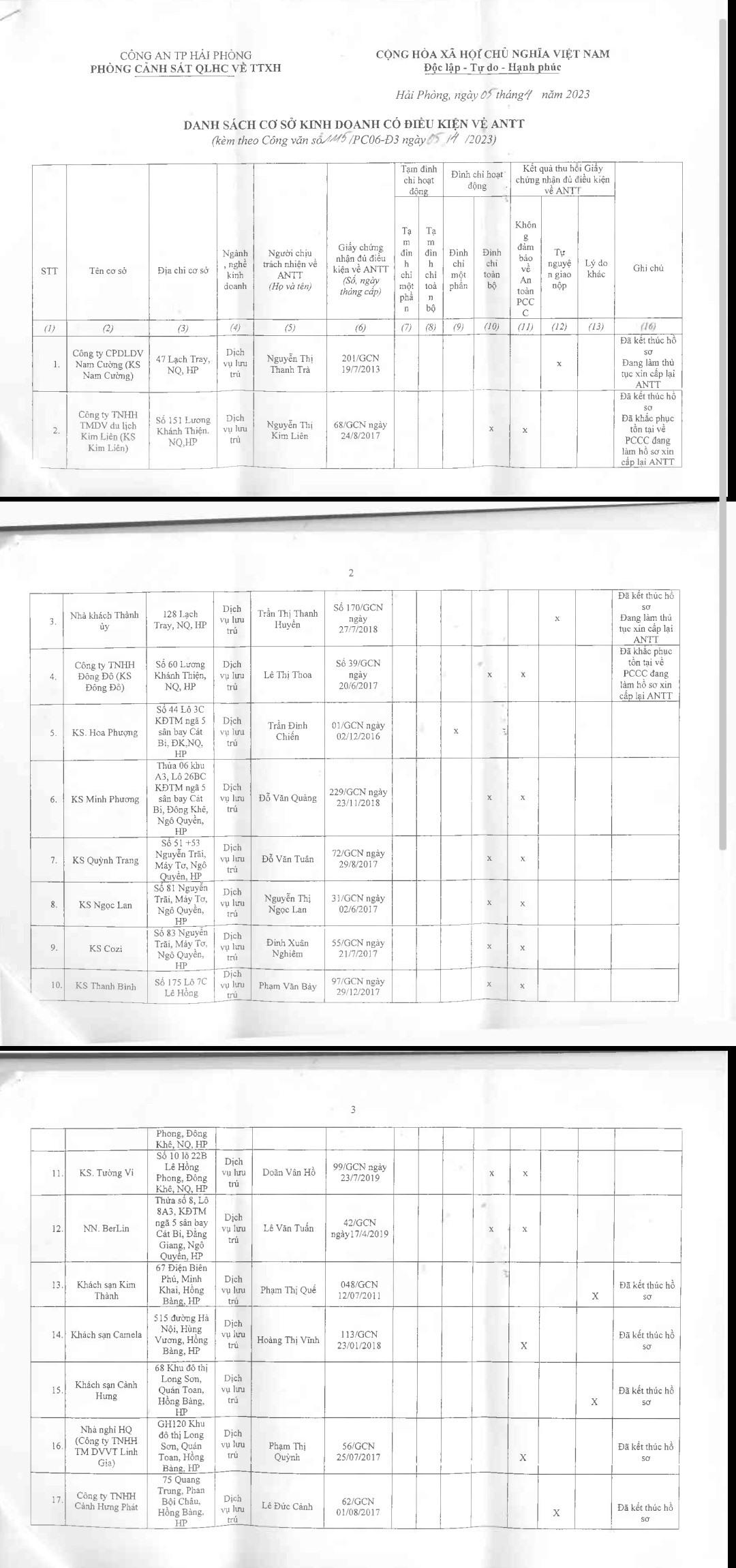 Thực hiện Công văn số 240/UBND-ĐC2 ngày 7.2.2023 của UBND TP.Hải Phòng về việc chấn chỉnh hoạt động của các cơ sở kinh doanh, dịch vụ trên địa bàn thành phố, Công an thành phố công bố danh sách 35 cơ sở kinh doanh có điều kiện về an ninh trật tự bị thu hồi Giấy chứng nhận đủ điều kiện về an ninh, trật tự.