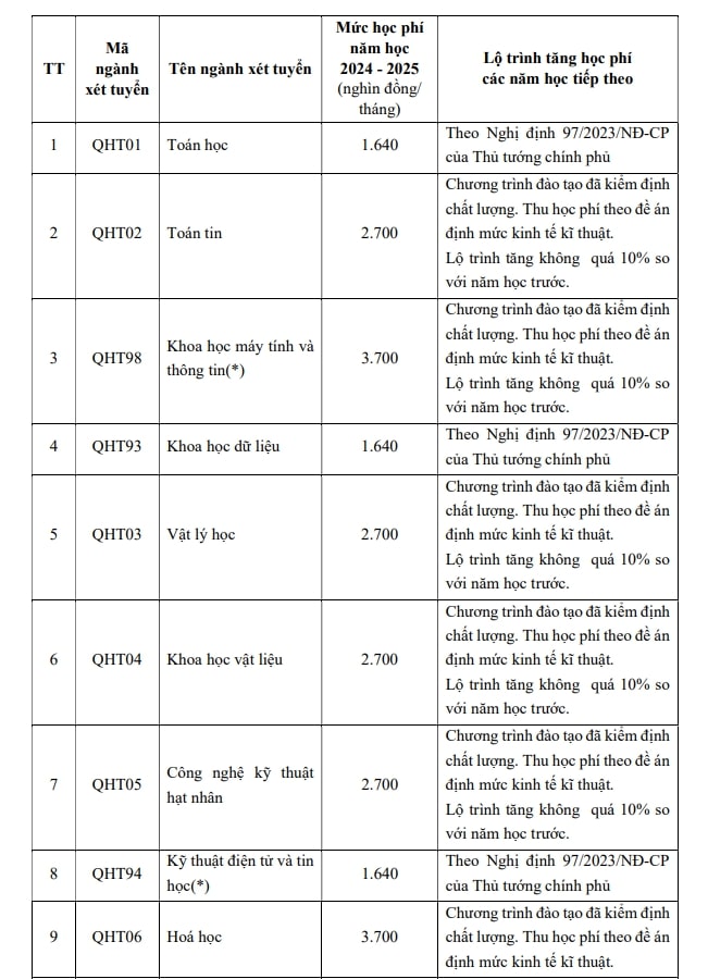 Mức thu học phí năm học 2024 - 2025 của Trường Đại học Khoa học tự nhiên, Đại học Quốc gia Hà Nội được công bố trong Đề án tuyển sinh.
