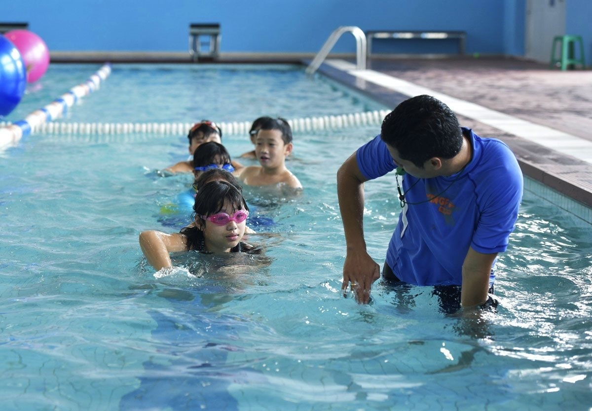 Dạy bơi cho trẻ tại bể bơi quận Long Biên. Ảnh: Nguyễn Quang