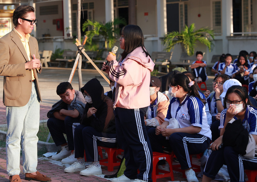 | Tác giả giao lưu định hướng chọn ngành, chọn nghề với học sinh Trường THPT Ninh Hải (tỉnh Khánh Hòa). Ảnh: NVCC |
