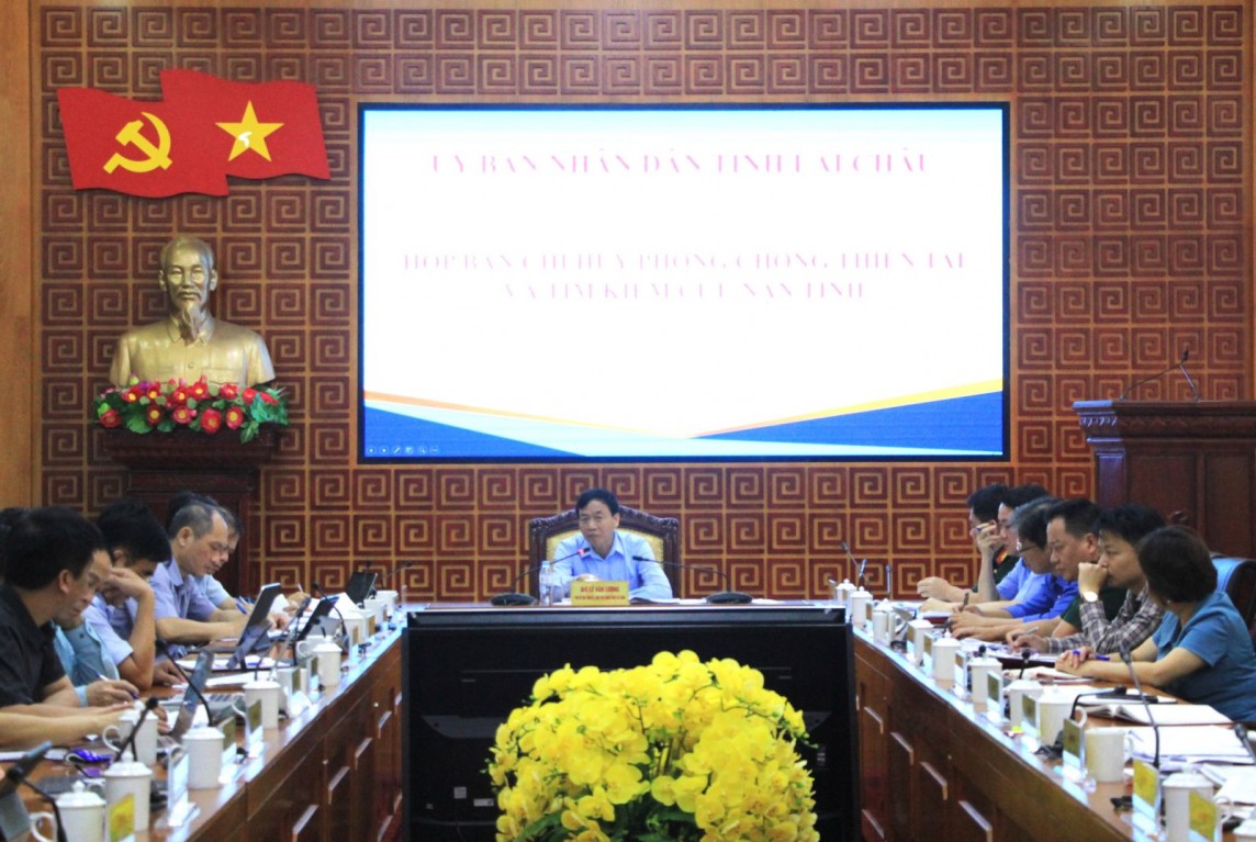 | Ông Lê Văn Lương - Chủ tịch UBND tỉnh Lai Châu chủ trì cuộc họp về công tác phòng, chống thiên tai và tìm kiếm cứu nạn (Ảnh: CTTĐTLC) |