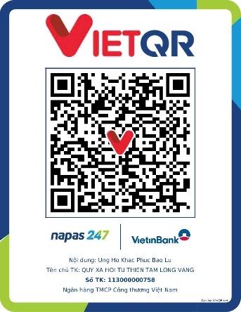 Mọi sự giúp đỡ xin gửi về: Quỹ XHTT Tấm lòng Vàng, số 51 Hàng Bồ, Hoàn Kiếm, Hà Nội. Điện thoại: 024.39232756. Số tài khoản (STK): 113000000758 tại Vietinbank Chi nhánh Hoàn Kiếm, Hà Nội. STK: 0021000303088 - tại Vietcombank - Chi nhánh Hà Nội, STK: 12410001122556 - tại BIDV - Chi nhánh Hoàn Kiếm. Hoặc quét mã QR sau: