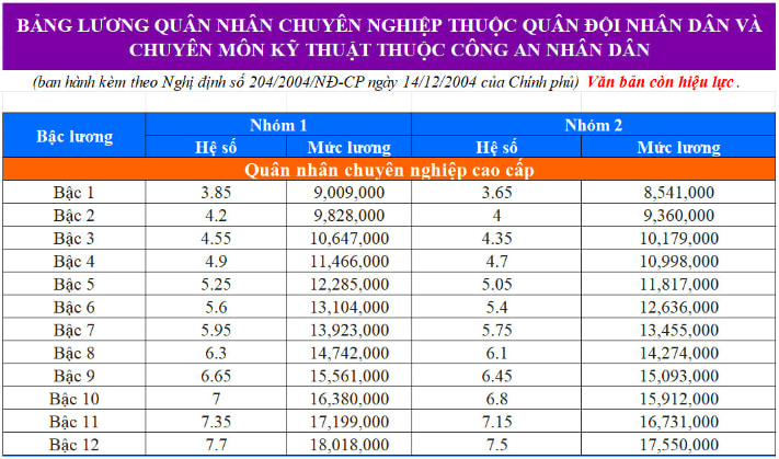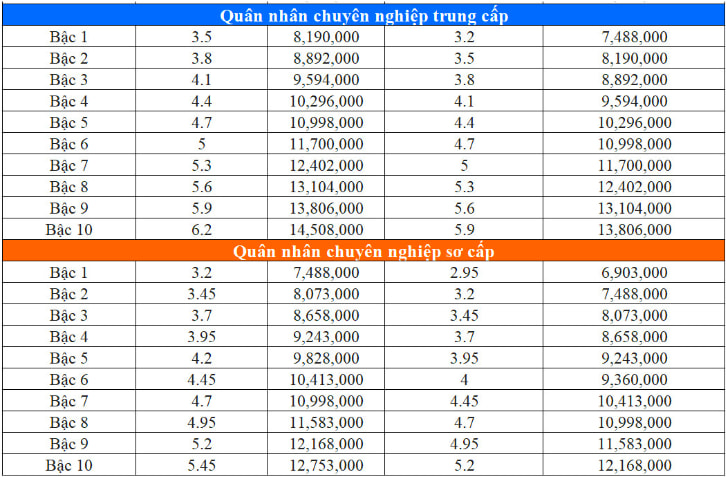 Ngoài ra, quân nhân chuyên nghiệp có mức lương cao nhất là 18.018.000 đồng, thấp nhất là 6.903.000 đồng.