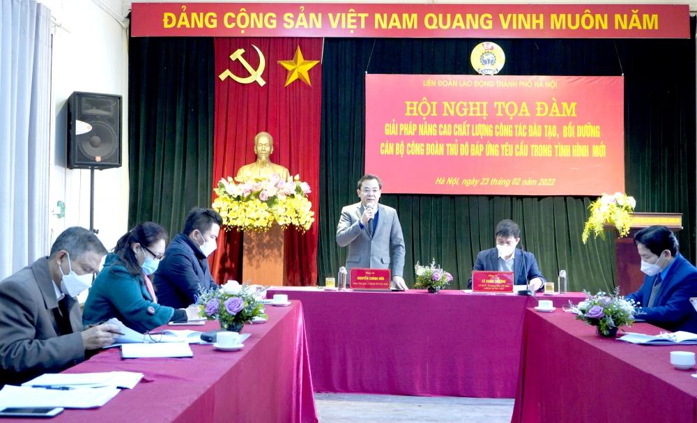 Phó Chủ tịch LĐLĐ thành phố Hà Nội Nguyễn Chính Hữu phát biểu tại Hội nghị tọa đàm “Giải pháp nâng cao chất lượng công tác đào tạo, bồi dưỡng cán bộ Công đoàn Thủ đô đáp ứng yêu cầu trong tình hình mới”. Ảnh: Mai Quý