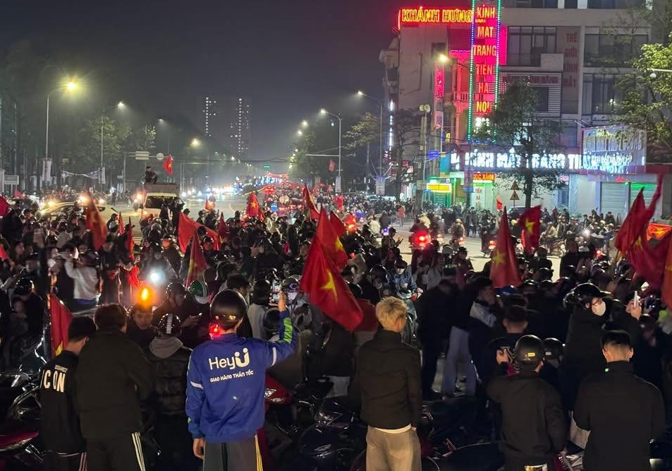 Tại Nghệ An, niềm vui ấy lan tỏa mạnh mẽ, biến nhiều tuyến phố thành “biển người” trong đêm ăn mừng chiến thắng lịch sử.