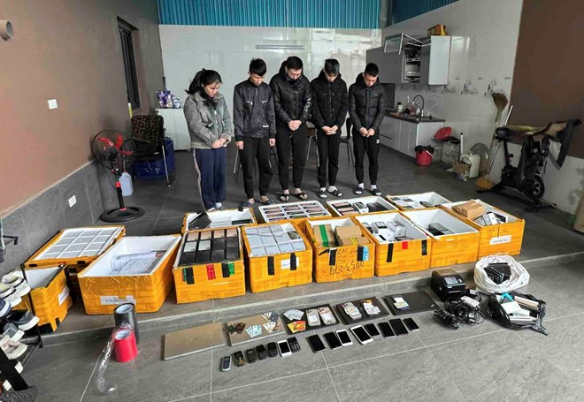 Khám xét khẩn cấp chỗ ở của các đối tượng, lực lượng chức năng đã thu giữ 5 máy tính xách tay, 10 điện thoại di động cá nhân của các đối tượng sử dụng, máy in đơn; máy khò; 139 vỏ hộp điện thoại iphone các loại và 262 hộp điện thoại iPhone nguyên kiện các loại (bên trong đựng điện thoại hỏng để chuẩn bị gửi đi); 24 thẻ ngân hàng các loại; 10 tài khoản ngân hàng phục vụ hoạt động lừa đảo chiếm đoạt tài sản, cùng các tang vật khác liên quan đến hành vi lừa đảo chiếm đoạt tài sản của nhóm đối tượng…