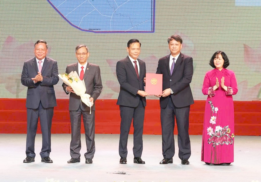 Bí thư Thành ủy Hà Nội Bùi Thị Minh Hoài và Phó Bí thư Thường trực Thành ủy Hà Nội Nguyễn Văn Phong trao quyết định cho lãnh đạo phường Phương Liệt.