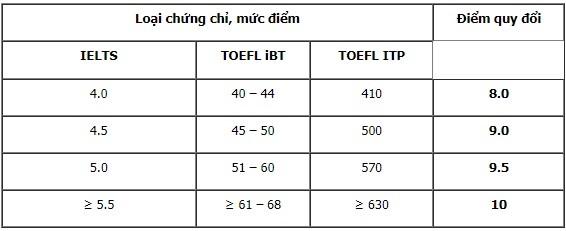 Điểm chứng chỉ tiếng Anh được quy đổi sang điểm xét tuyển (thang điểm 10) như sau: