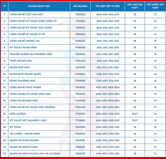 Đối với Khối ngành sức khỏe (Kỹ thuật xét nghiệm y học, Điều dưỡng): Điểm trung bình cộng của 3 môn trong tổ hợp xét tuyển đạt từ 6,5 điểm trở lên và học lực lớp 12 xếp từ loại khá trở lên hoặc điểm xét tốt nghiệp từ 6,5 trở lên.