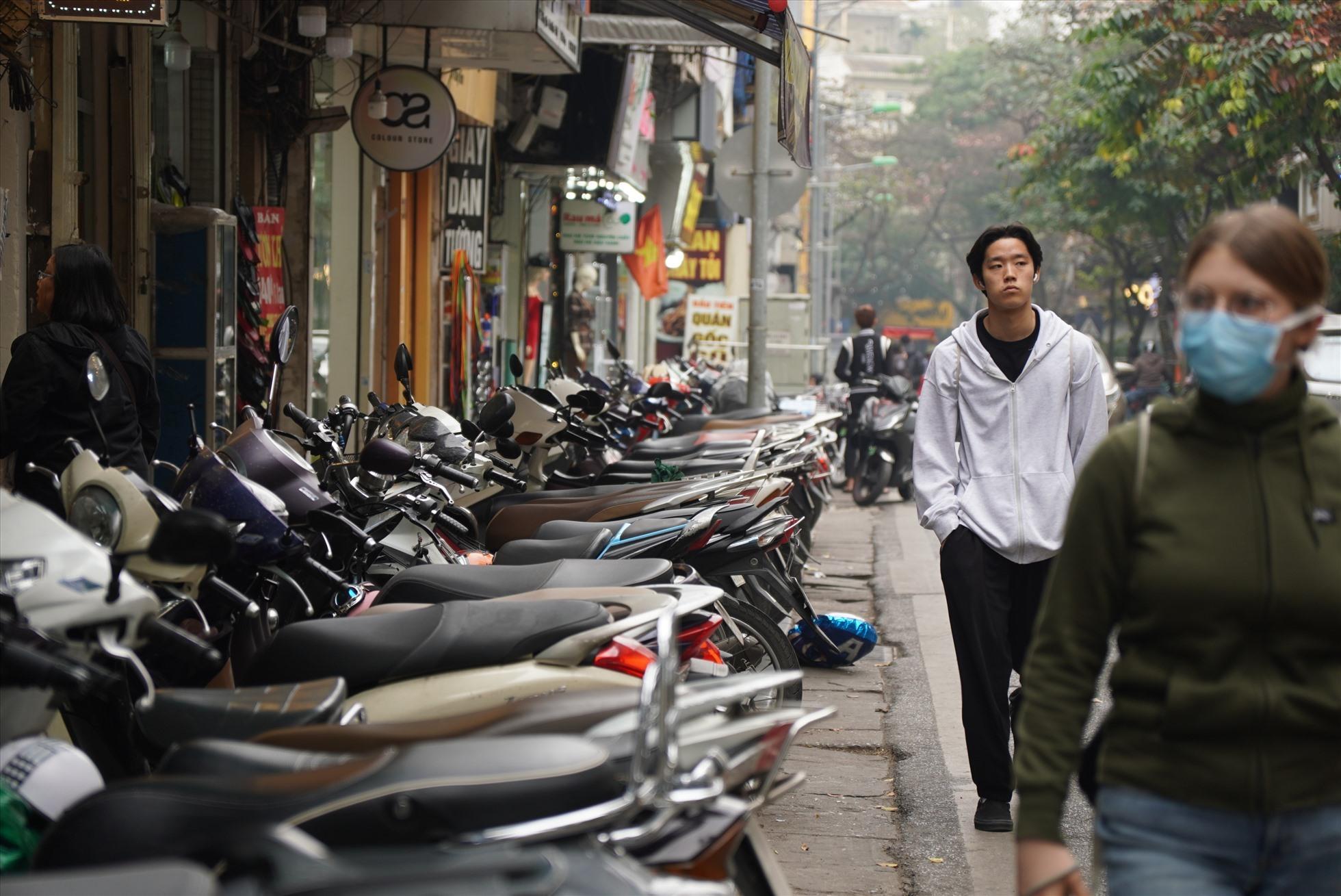 Anh Nam kể, để len lỏi giữa hàng dài phương tiện dừng đỗ trên vỉa hè là điều rất khó. Thế nên, anh cùng nhiều người dân khác phải đi xuống lòng đường đông đúc xe cộ.