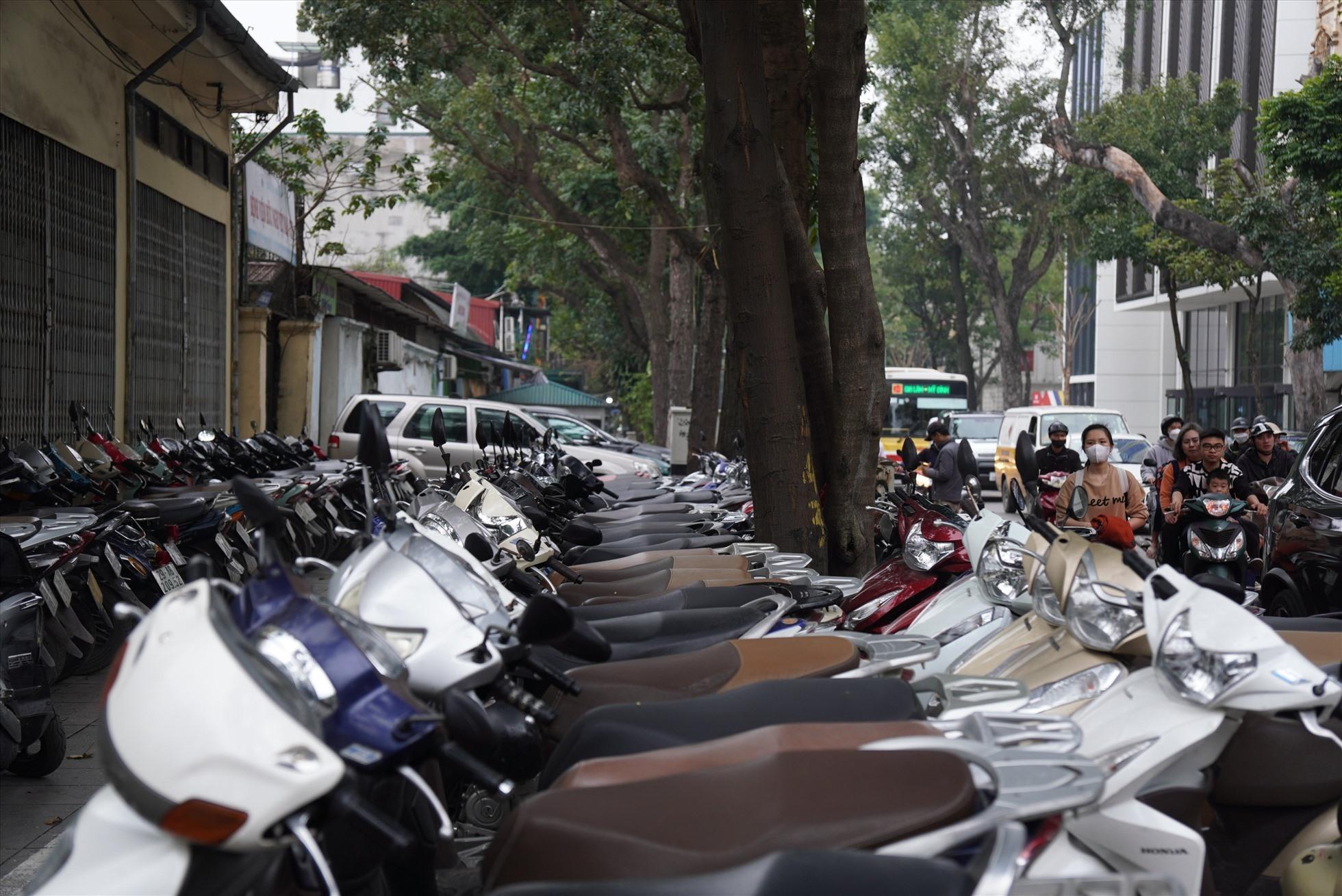 Tương tự, tại phố Quang Trung ( quận Hoàn Kiếm), những xe máy xếp hàng 2, hàng 3 khiến cho toàn bộ không gian vỉa hè chỉ còn lại duy nhất một lối nhỏ cho người ra vào gửi xe.