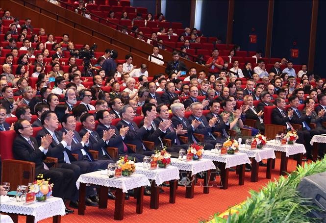 Tổng Bí thư Tô Lâm, các đồng chí lãnh đạo, nguyên lãnh đạo Đảng Nhà nước dự Lễ kỷ niệm. Ảnh: Thống Nhất/TTXVN