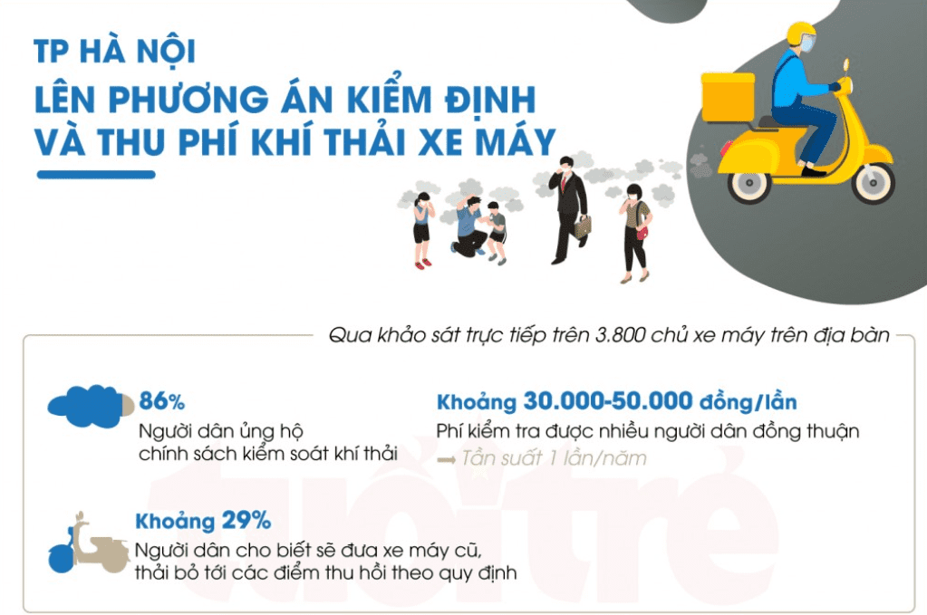 Sở TN&MT Hà Nội dự kiến từ năm 2024 sẽ thí điểm kiểm định khí thải xe máy đã sử dụng 5 năm trở lên, tần suất 1 lần/năm. Hà Nội cũng đang tính toán phương án thu phí khí thải xe máy.