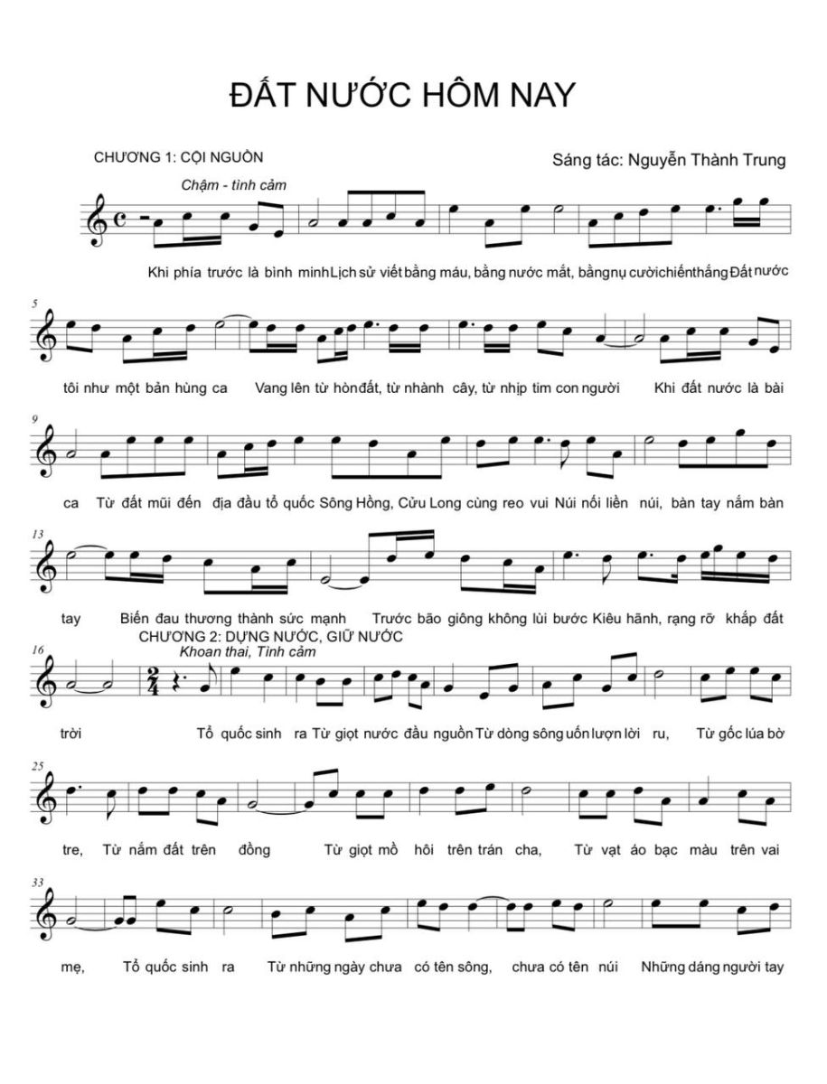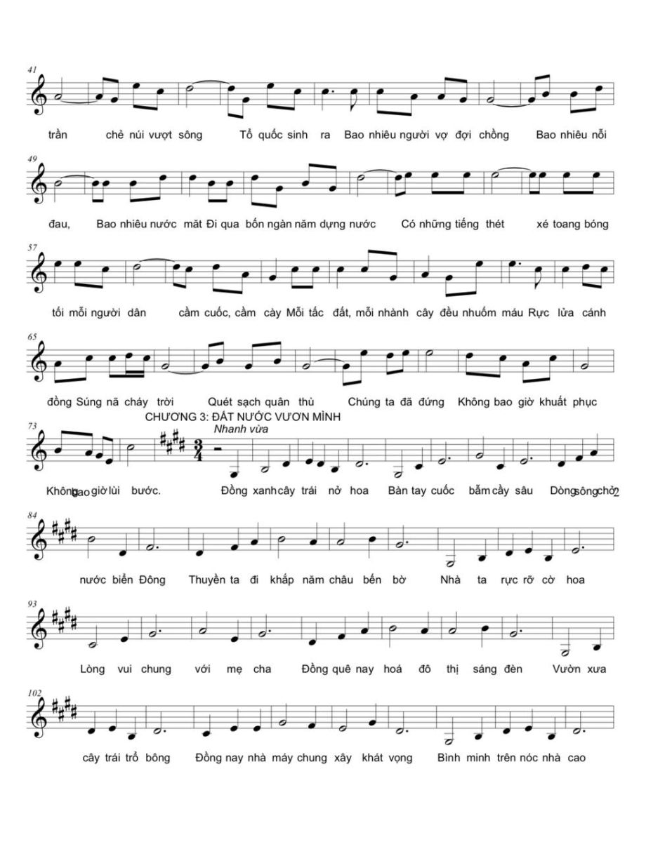 Ngay từ chương mở đầu, tác giả đặt nền tảng bằng giọng La thứ (Am), nhịp 4/4, giai điệu khoan thai, trang trọng. Đây là lựa chọn tinh tế: giọng thứ gợi sắc thái trầm mặc, bi hùng, phù hợp với chủ đề “cội nguồn” – nơi đất nước sinh ra từ máu, nước mắt, đau thương nhưng cũng trỗi dậy trong niềm kiêu hãnh.