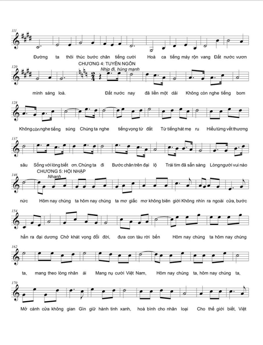 Đặc biệt, câu hát “Đất nước vươn mình sáng lòa” được đẩy lên cao trào, giai điệu sáng, cao vút, mang sắc thái khẳng định. Đây không chỉ là mô tả thực tại, mà còn là tuyên ngôn lạc quan về sự phát triển, hội nhập.