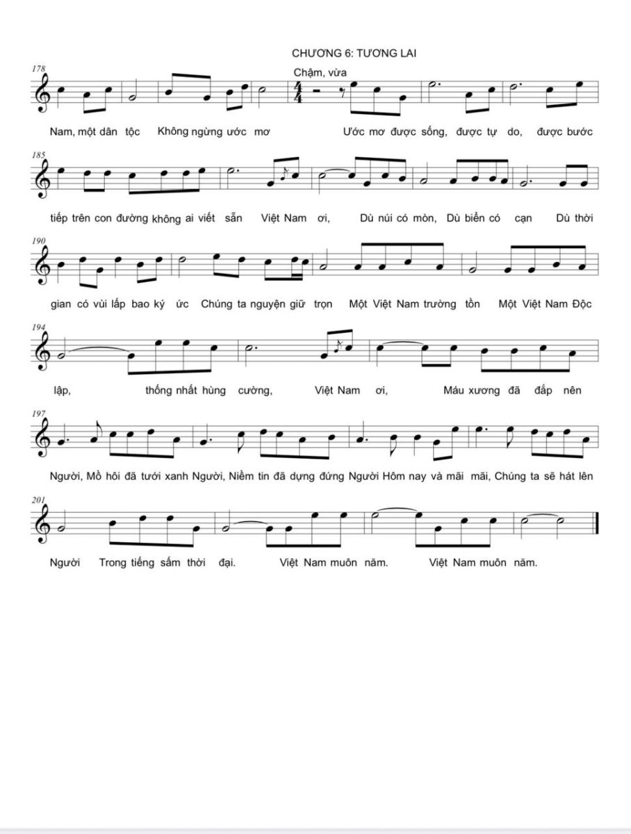 Về ca từ, chương II chính là trục bản lề lịch sử: từ những ngày chưa có tên sông, tên núi; đến bốn ngàn năm dựng nước; đến lời khẳng định “không bao giờ khuất phục, không bao giờ lùi bước”. Đây là sự kết tinh giữa trữ tình – hiện thực – anh hùng ca.