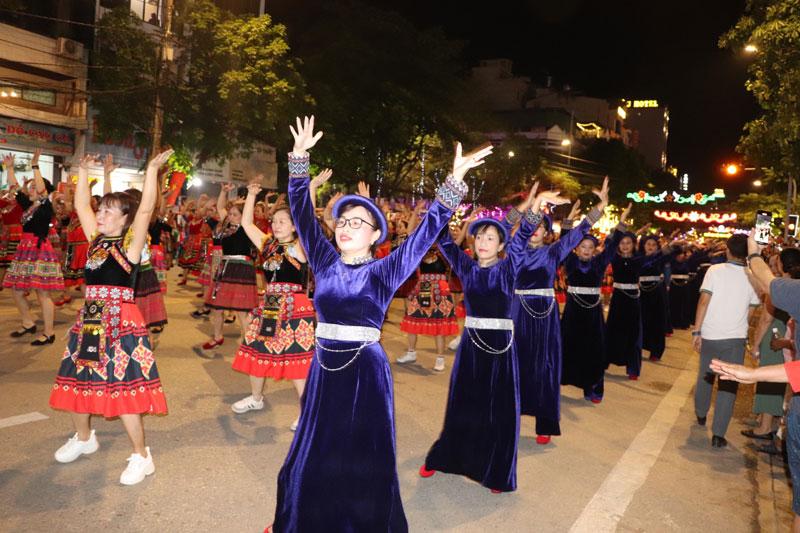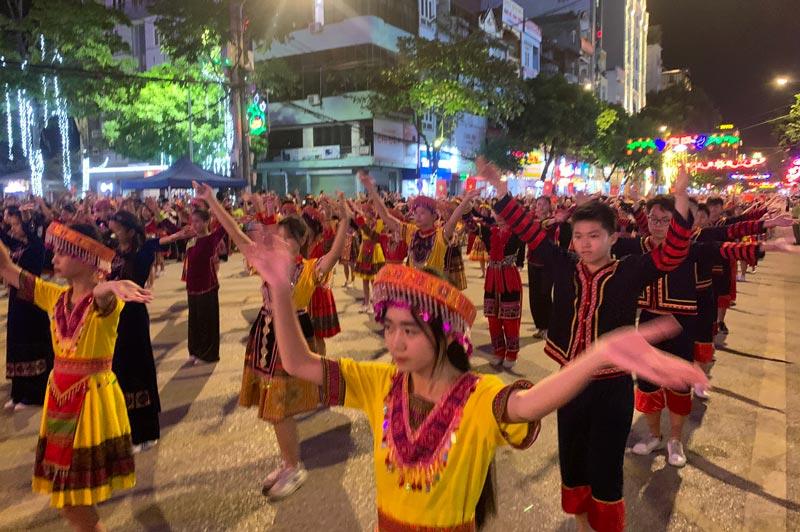 Sau khi tỉnh Cao Bằng Khai mạc Tuần Văn hóa -Thể thao - Du lịch và đón nhận Bằng chứng nhận Công viên địa chất toàn cầu UNESCO Non nước Cao Bằng, tiết mục nhảy dân vũ thể thao với chủ đề “ Vũ điệu miền non nước” với sự tham gia của 3.000 đã diễn ra trên phố đi bộ Kim Đồng. Ảnh: Vũ Đệ.