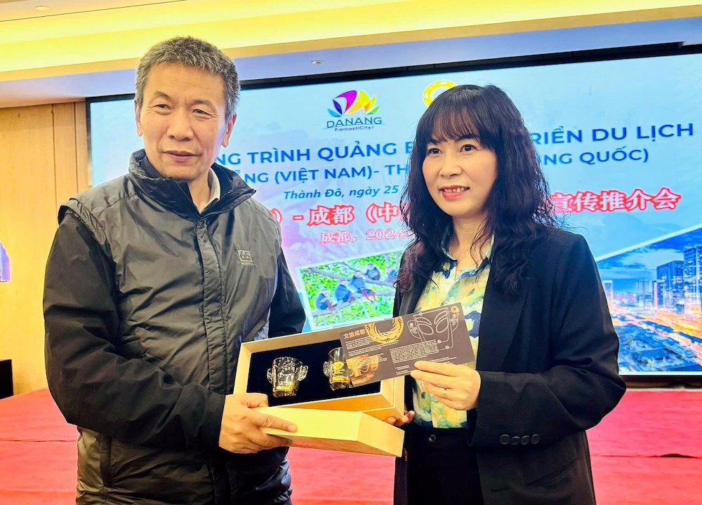 Đại diện ngành Du lịch Thành Đô trao quà lưu niệm kết nối cho bà Trương Thị Hồng Hạnh, Giám đốc Sở Du lịch Đà Nẵng