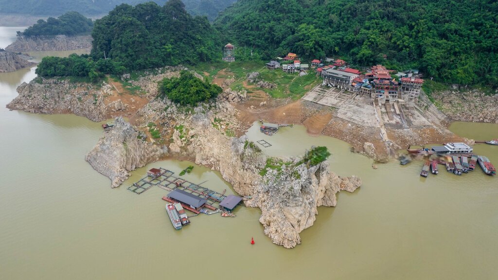 Toàn cảnh hồ Hòa Bình ngày 11.06.2025, thời điểm nước cạn sâu, để lộ nhiều bãi đất đá từng ngập dưới mặt nước. Các đảo đá nhô cao rõ rệt giữa lòng hồ. Ảnh: Đức Thịnh