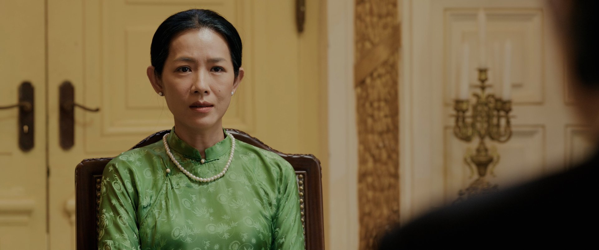 Nhân vật không được nêu tên cụ thể nhưng vẻ đẹp và phong thái, sự điềm tĩnh dễ khiến khán giả liên tưởng đến nguyên Phó Chủ tịch nước Nguyễn Thị Bình.