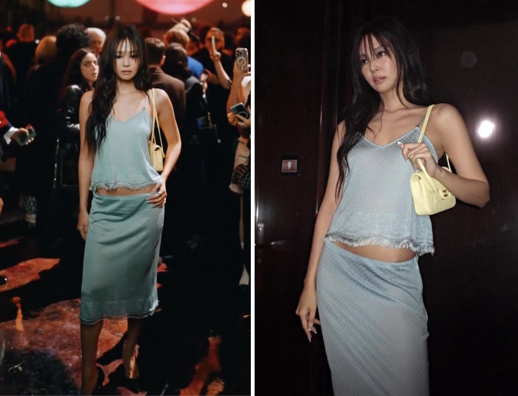 Jennie diện sét đồ áo 2 dây và chân váy lụa màu xanh pastel, kết hợp với phụ kiện là chiếc túi vàng nổi bật. Đặc biệt, nữ ca sĩ để kiểu tóc xõa tự nhiên, trang điểm mắt khói quyến rũ tạo điểm nhấn.